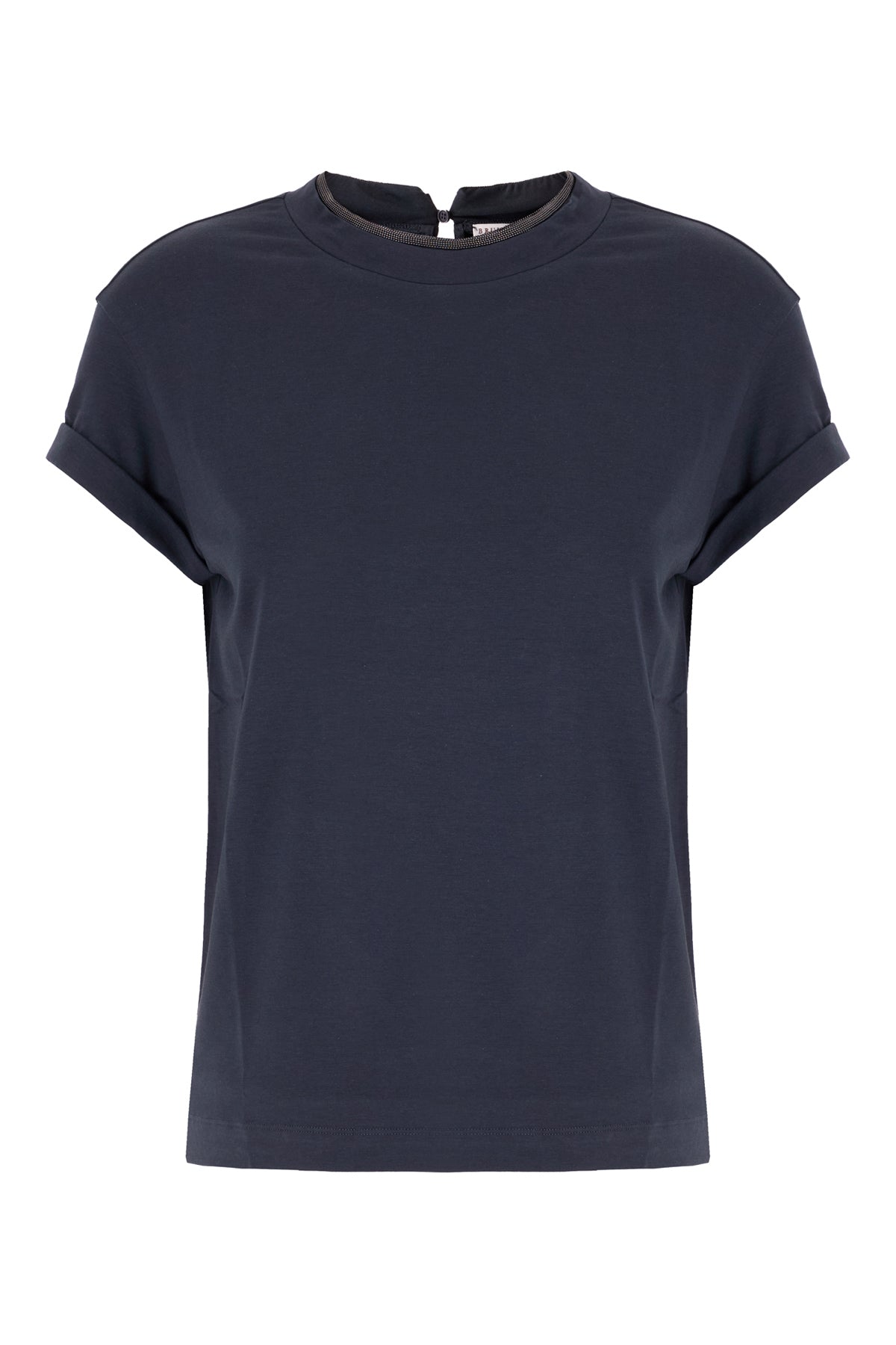 T-shirt realizzata in puro cotone arricchita da dettaglio gioiello sulla colletto.