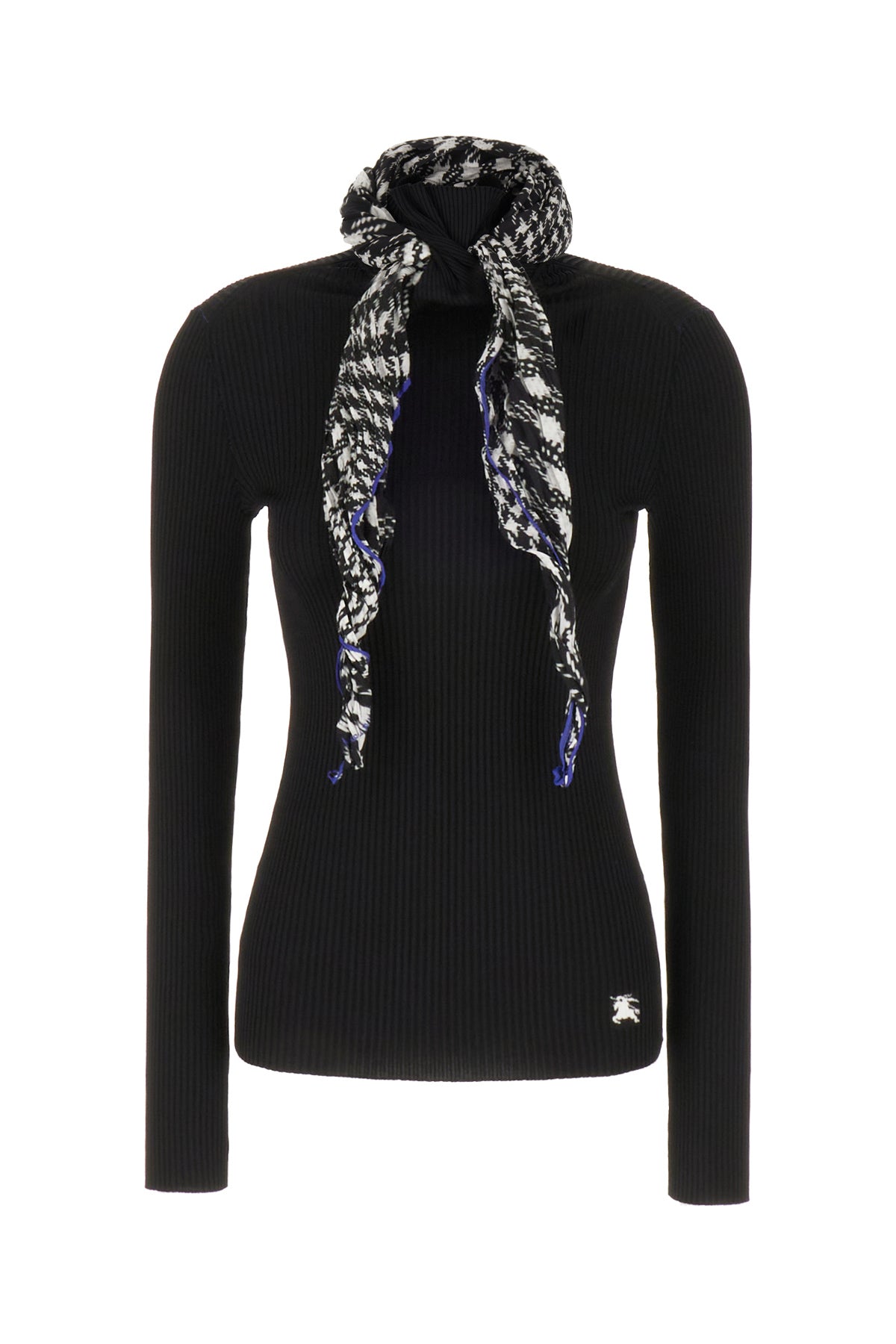 Top realizzato in misto viscosa stretch a costine caratterizzato da ricamo Equestrian Knight Design a contrasto sul fondo arricchito da sciarpina amovibile in seta stampata.