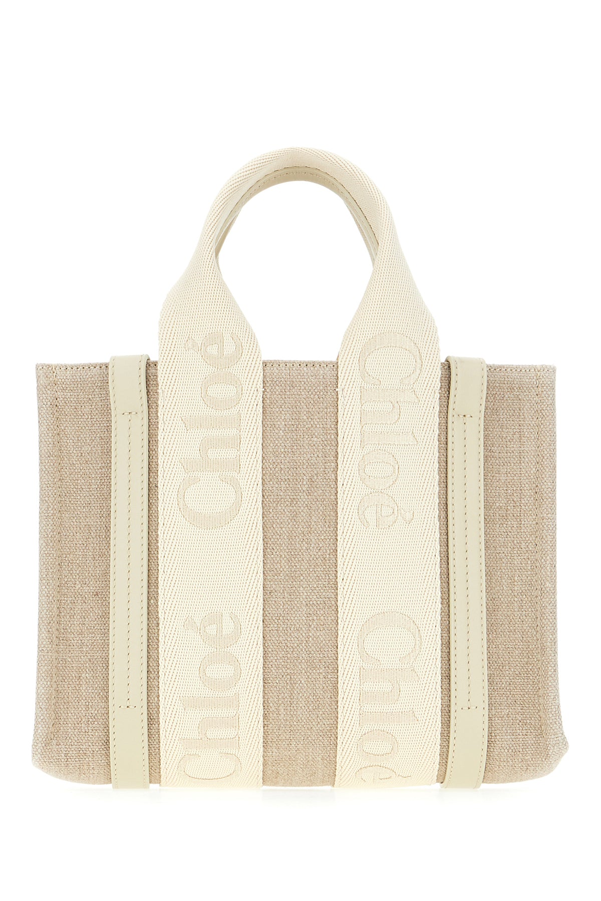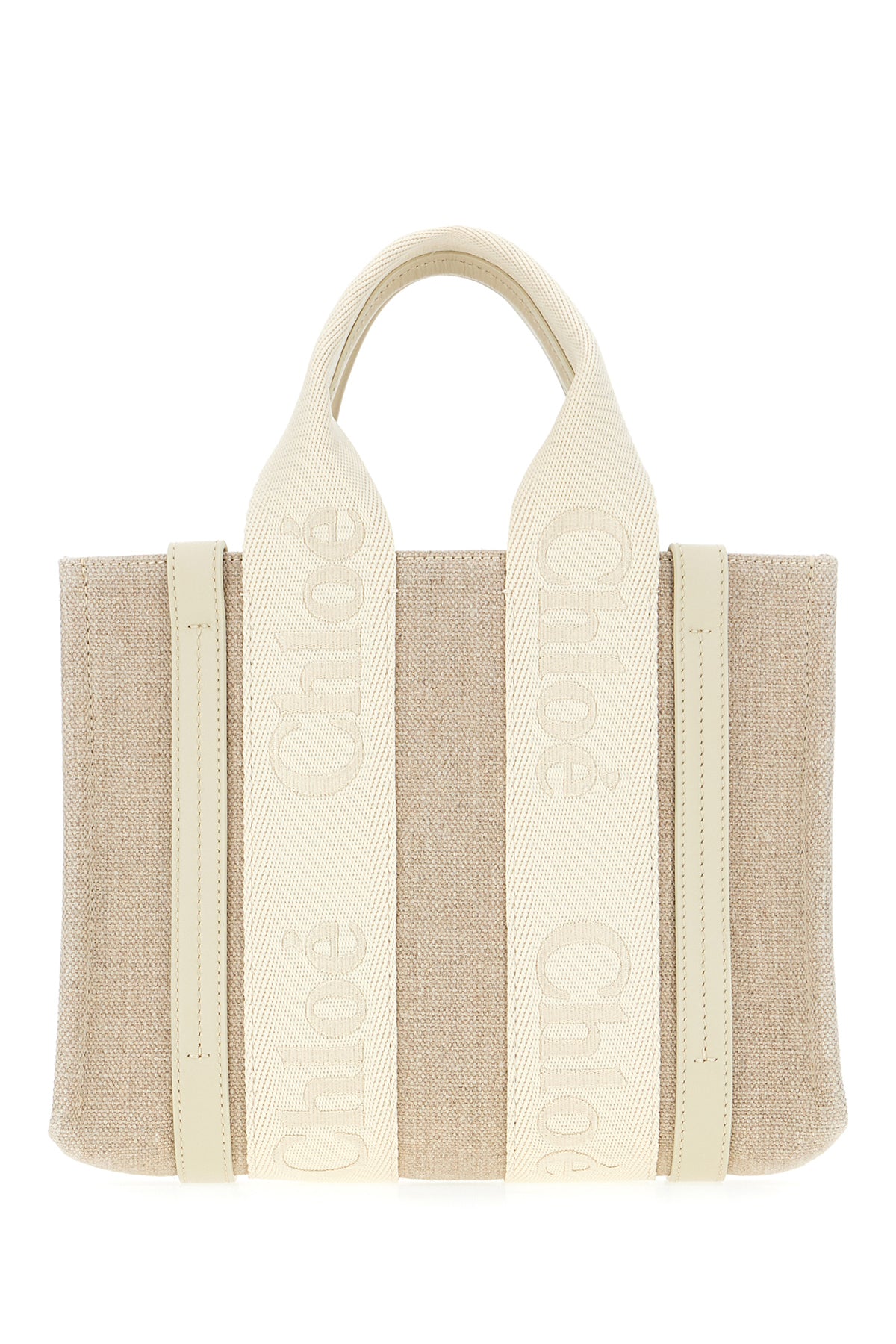 Borsa a mano realizzata in lino arricchita da nastro Woody ed inserti in pelle a contrasto.