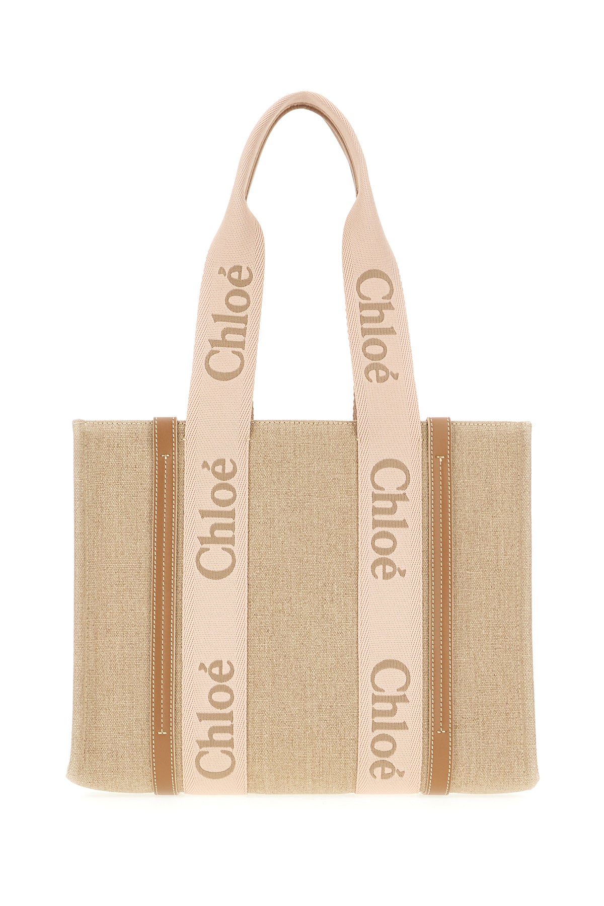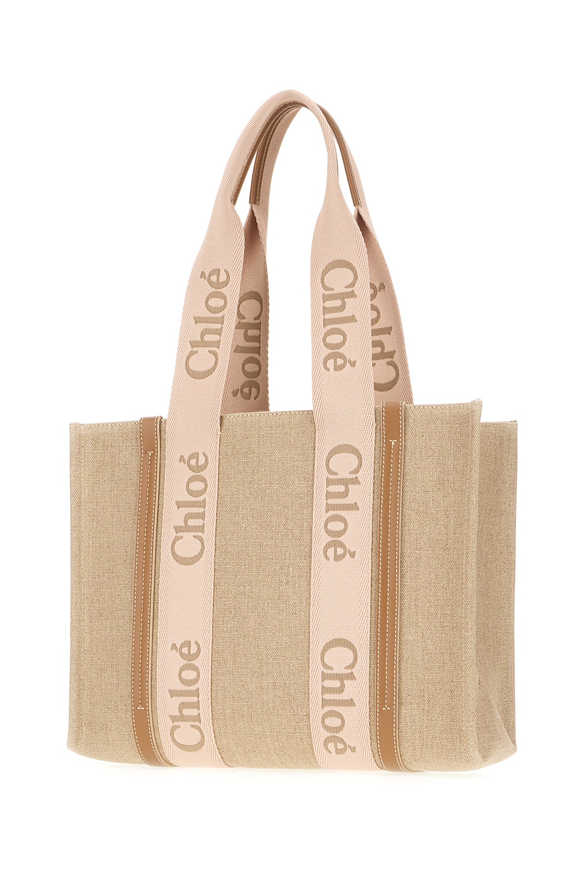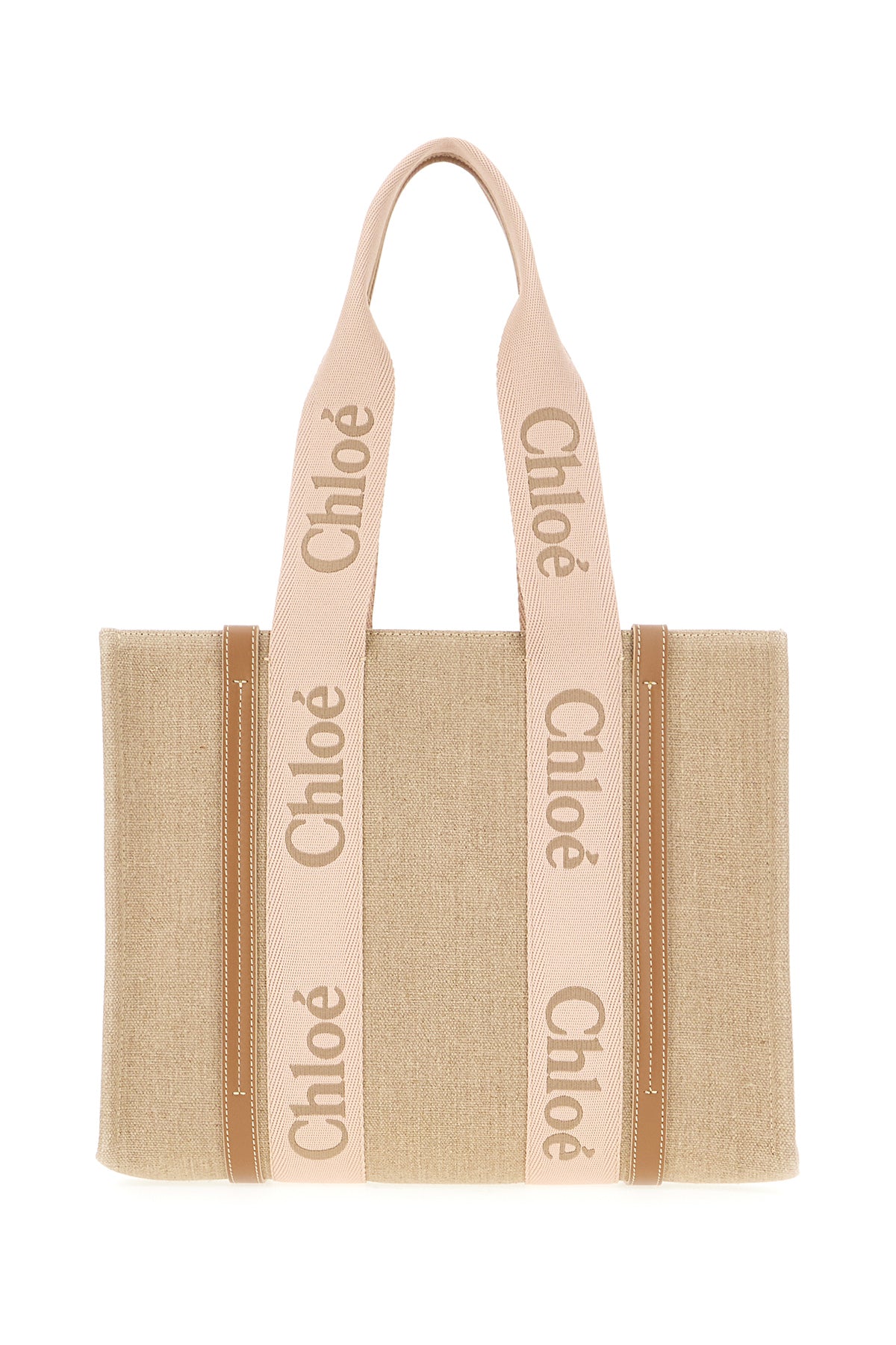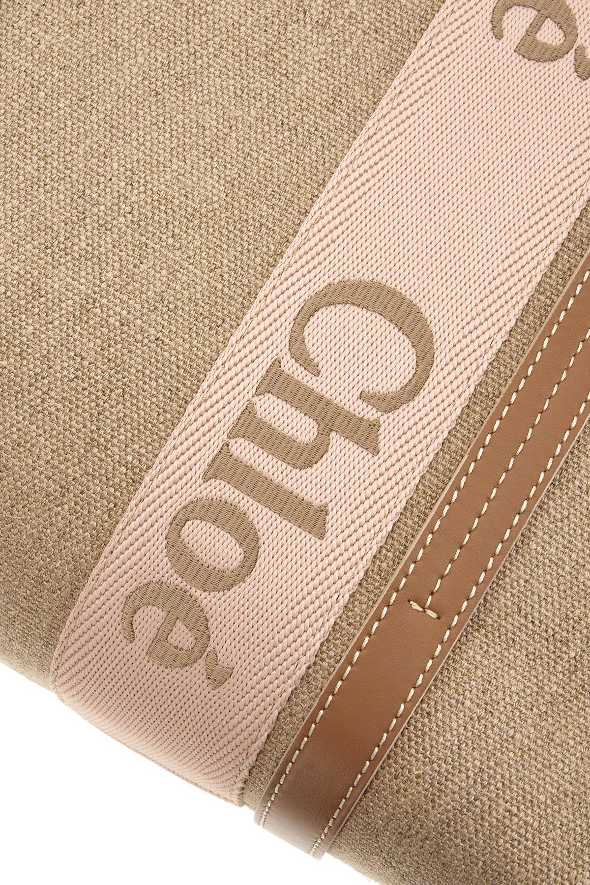 Borsa shopping realizzata in lino arricchita da nastro Woody ed inserti in pelle a contrasto.
