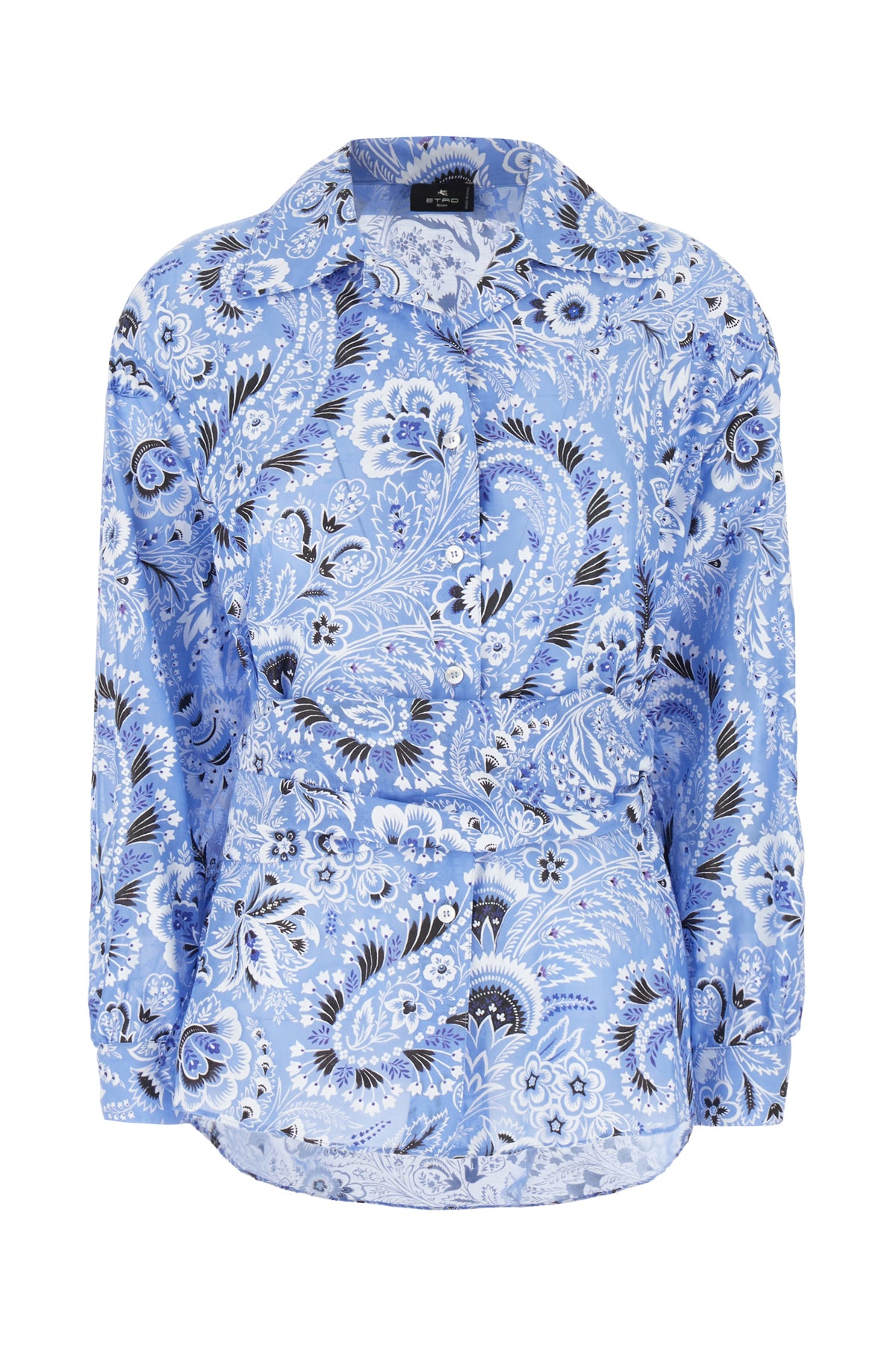 Blusa realizzata in cotone e seta caratterizzata da particolare stampa su tutta la superficie arricchita da inserto in tessuto da annodare in vita.