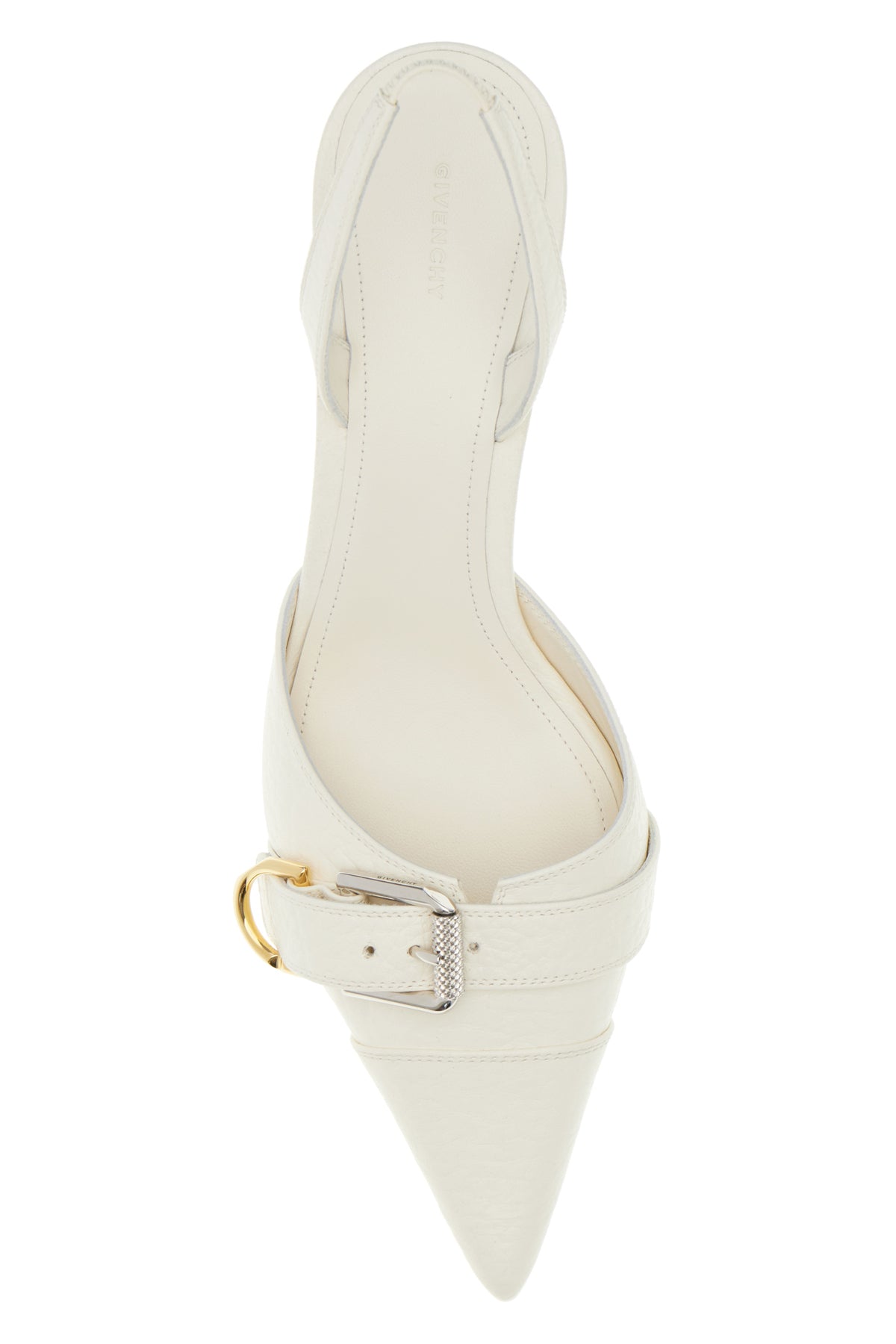 Slingback realizzate in pelle bovina liscia arricchite da cinturini decorativi sulla punta.