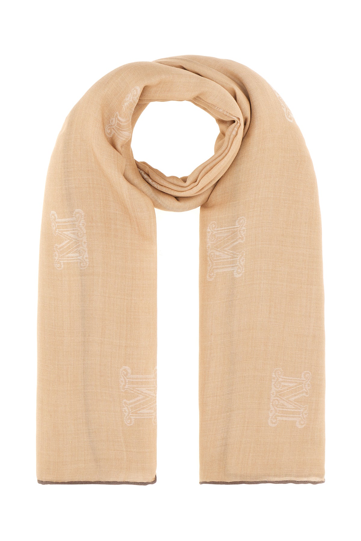 Sciarpa realizzata in lana e seta caratterizzata da ricamo logato a contrasto su tutta la superficie.