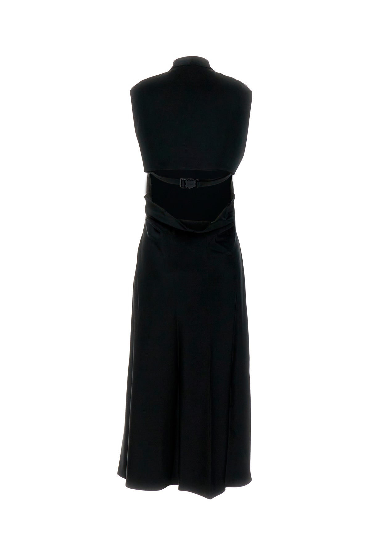 Abito midi realizzato in raso di misto acetato stretch caratterizzato da dettaglio cut-out sul retro arricchito da inserti in tessuto tonale con cinturino sul retro.