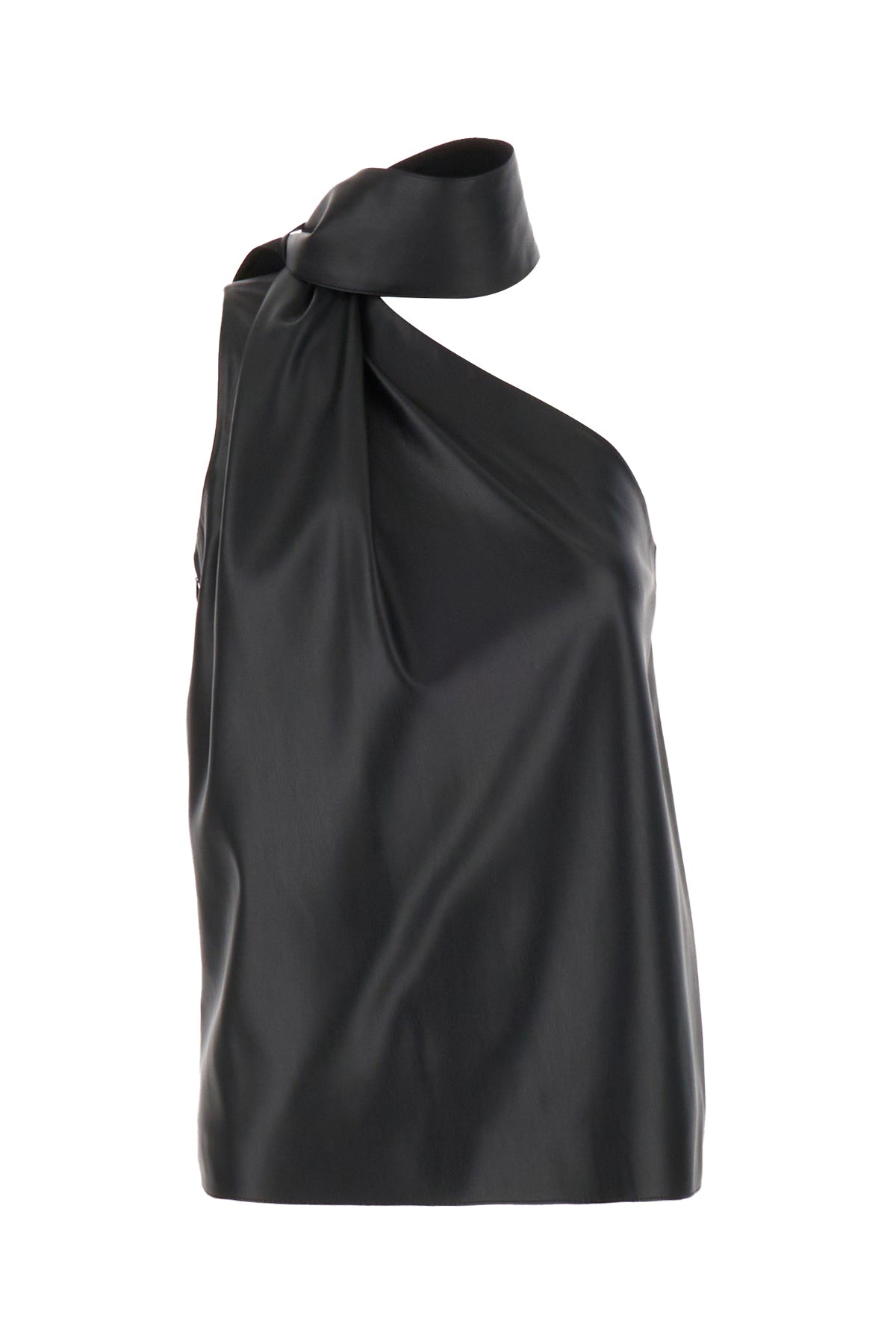 Top monospalla realizzato in simil pelle caratterizzato da inserto in simil pelle tonale da annodare sulla spalla.