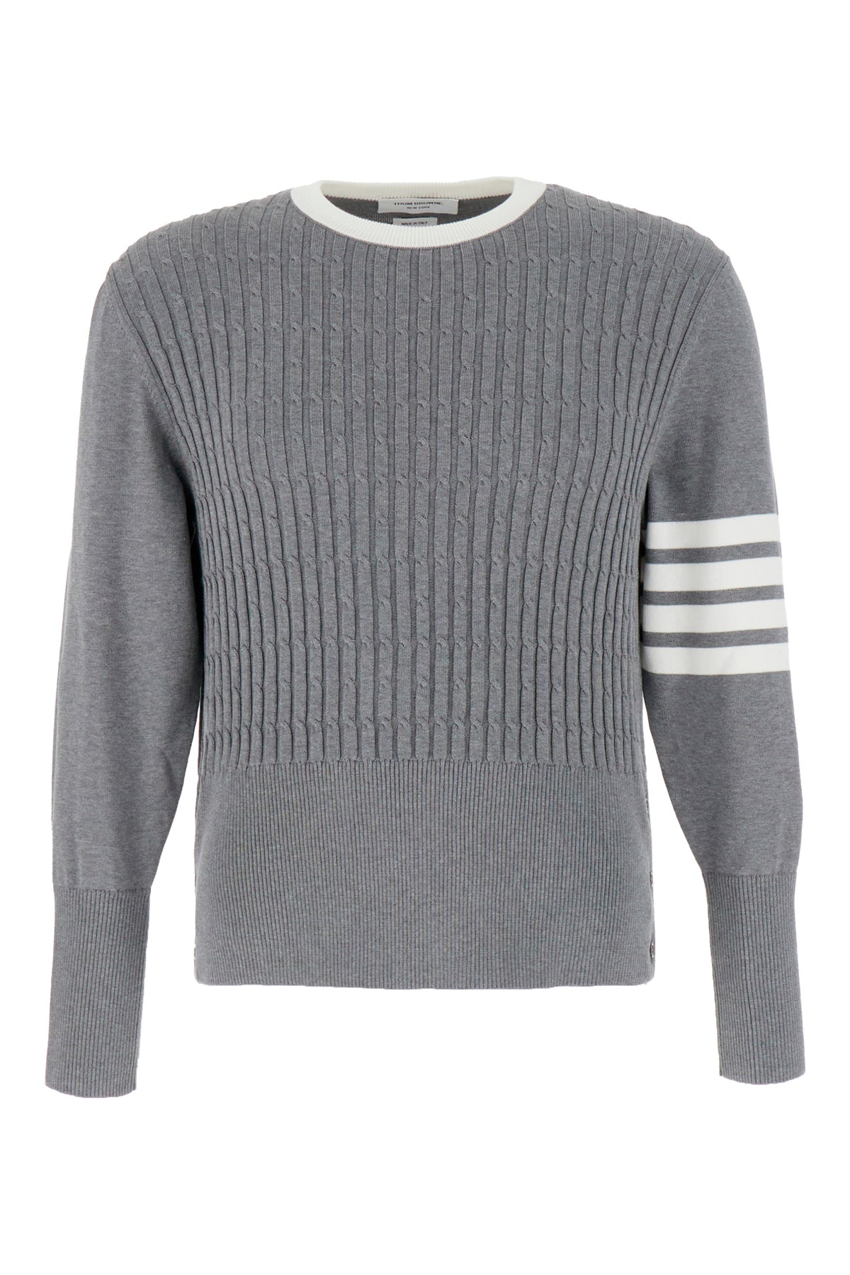 Maglione lavorato a maglia realizzato in puro cotone caratterizzato da ricamo a righe a contrasto sulla manica arricchito da iconica etichetta tricolore sul retro.