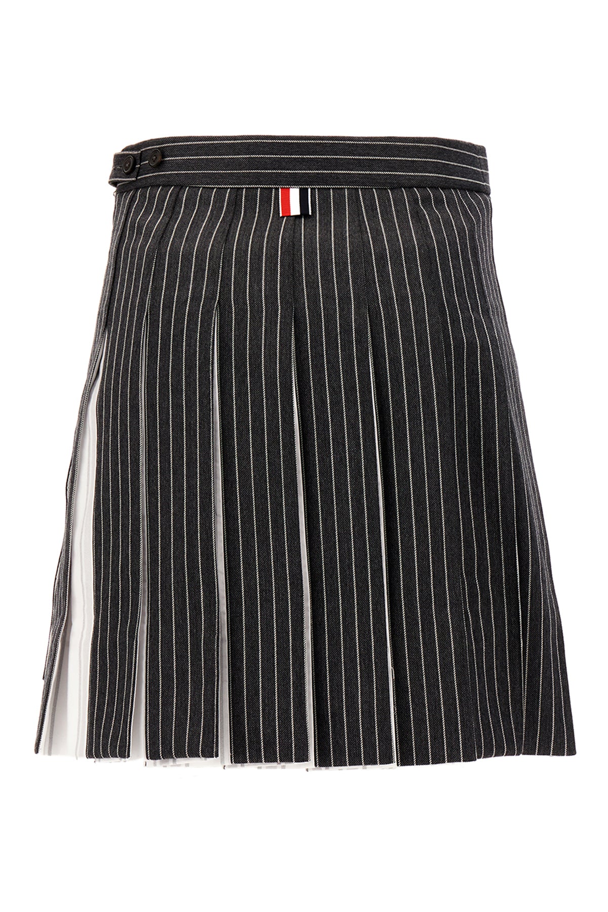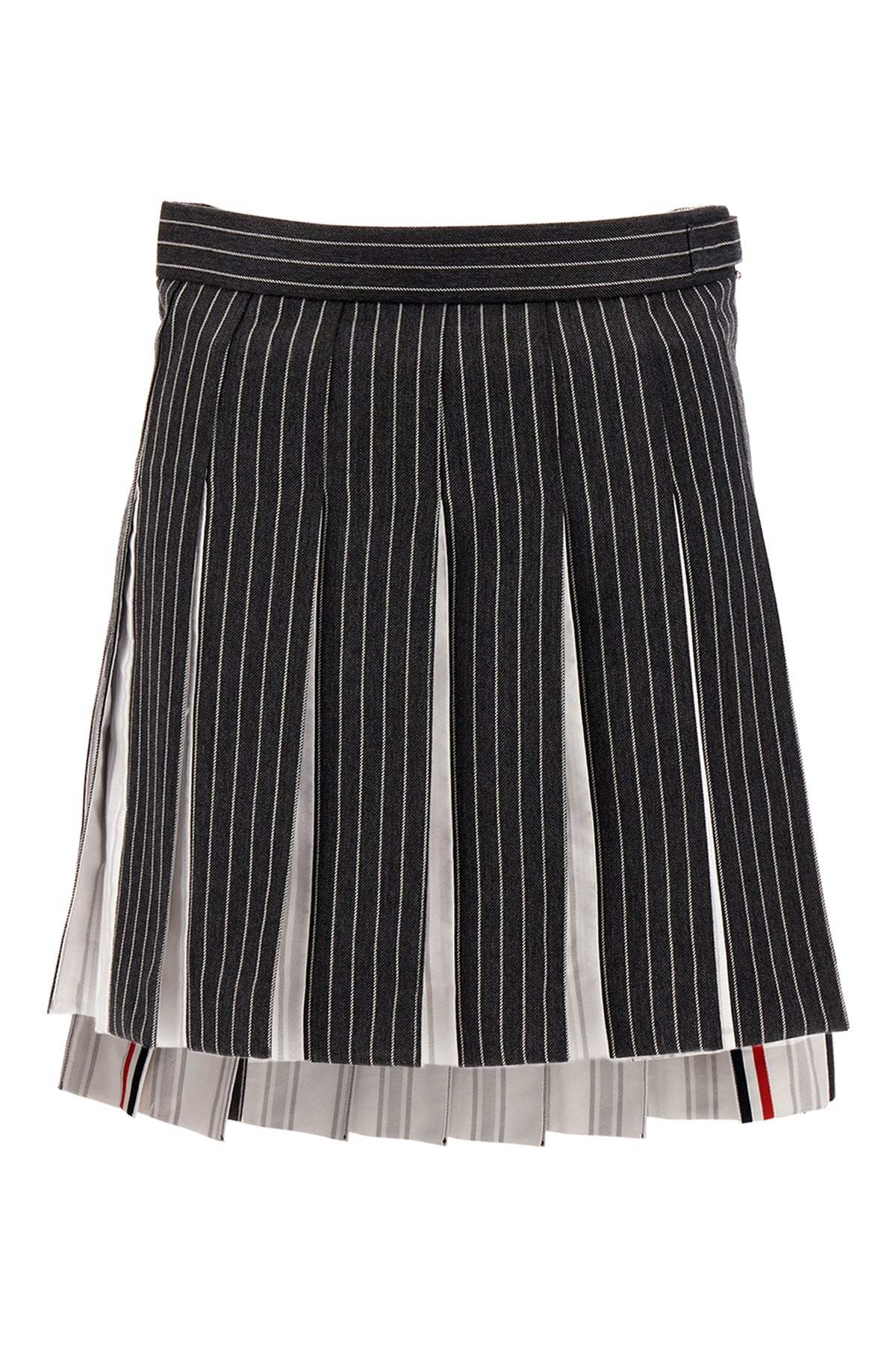 Minigonna realizzata in pura lana plissettata caratterizzata da ricamo a righe su tutta la superficie arricchita da iconica etichetta tricolore sul retro.