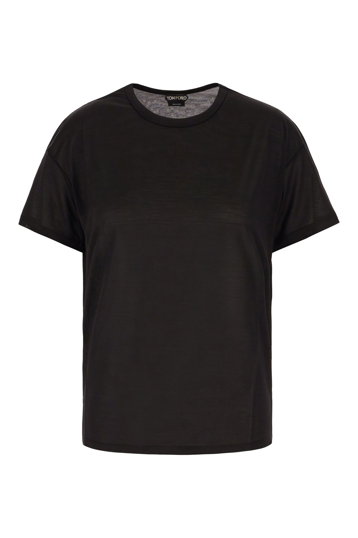 T-shirt realizzata in pura seta semitrasparente arricchita da etichetta logata a contrasto sul retro.