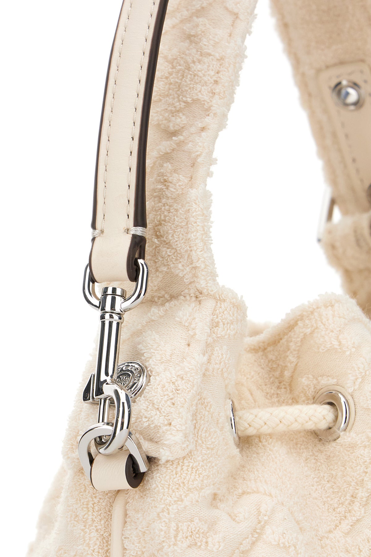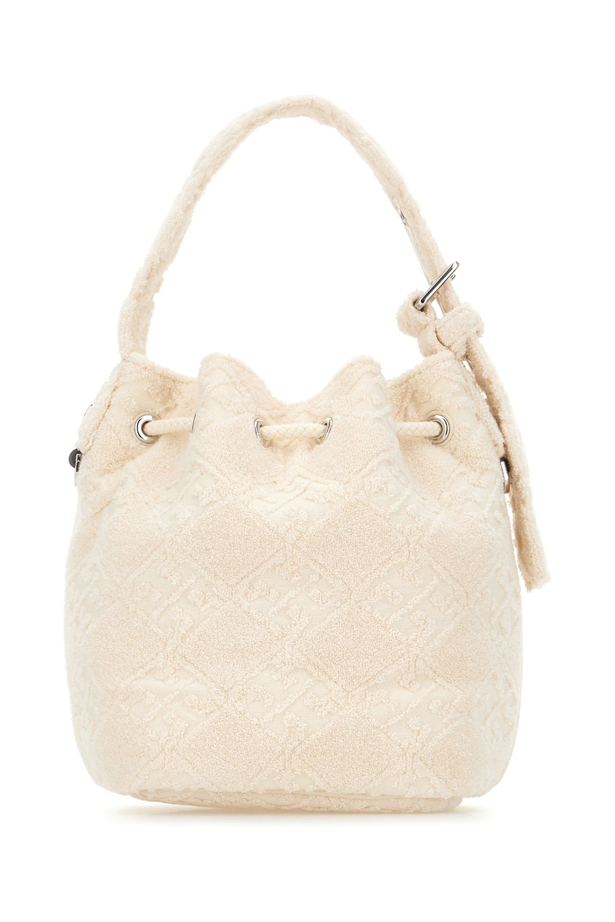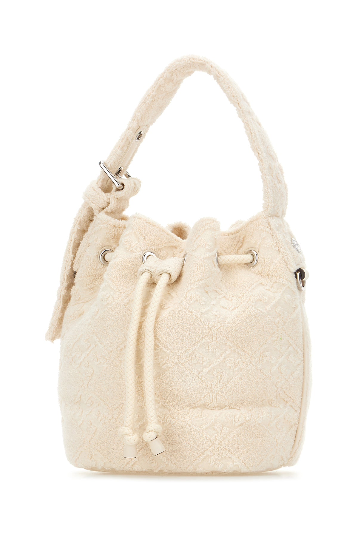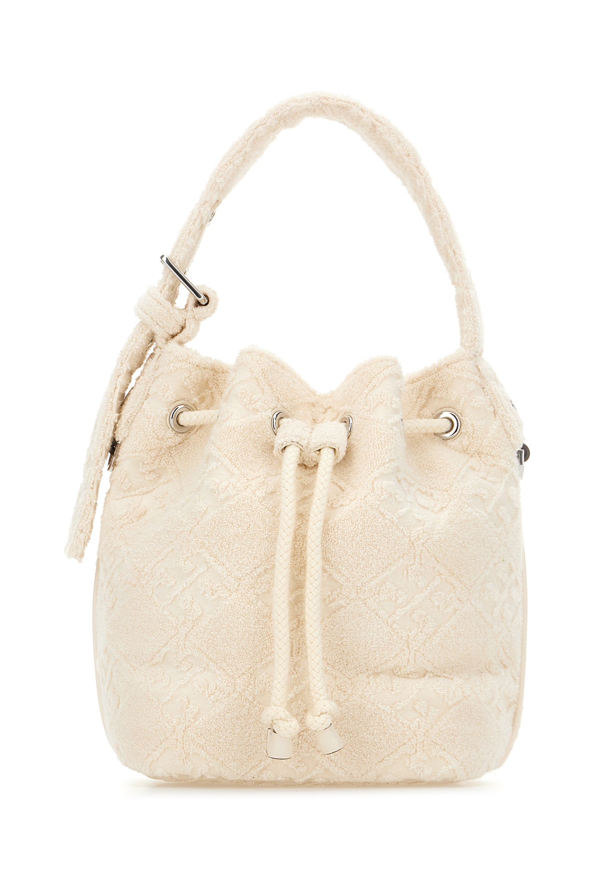 Borsa a secchiello realizzata in spugna caratterizzata da motivo logato tonale su tutta la superficie.