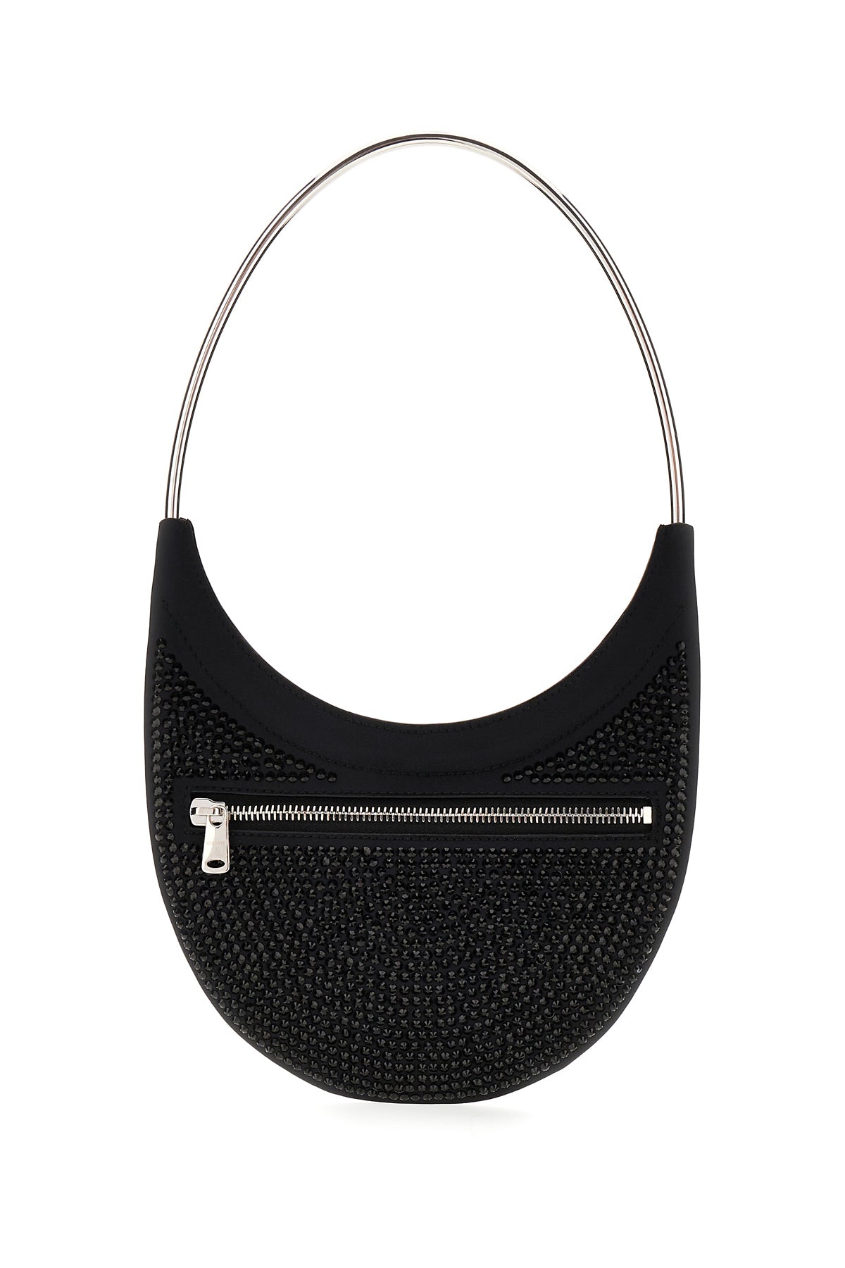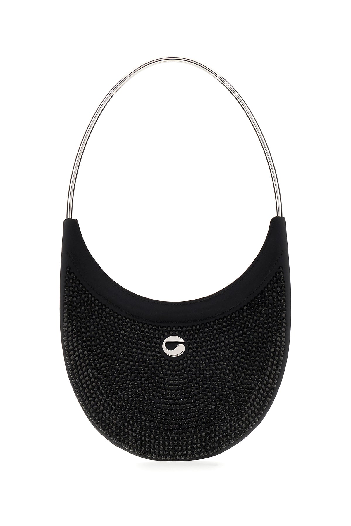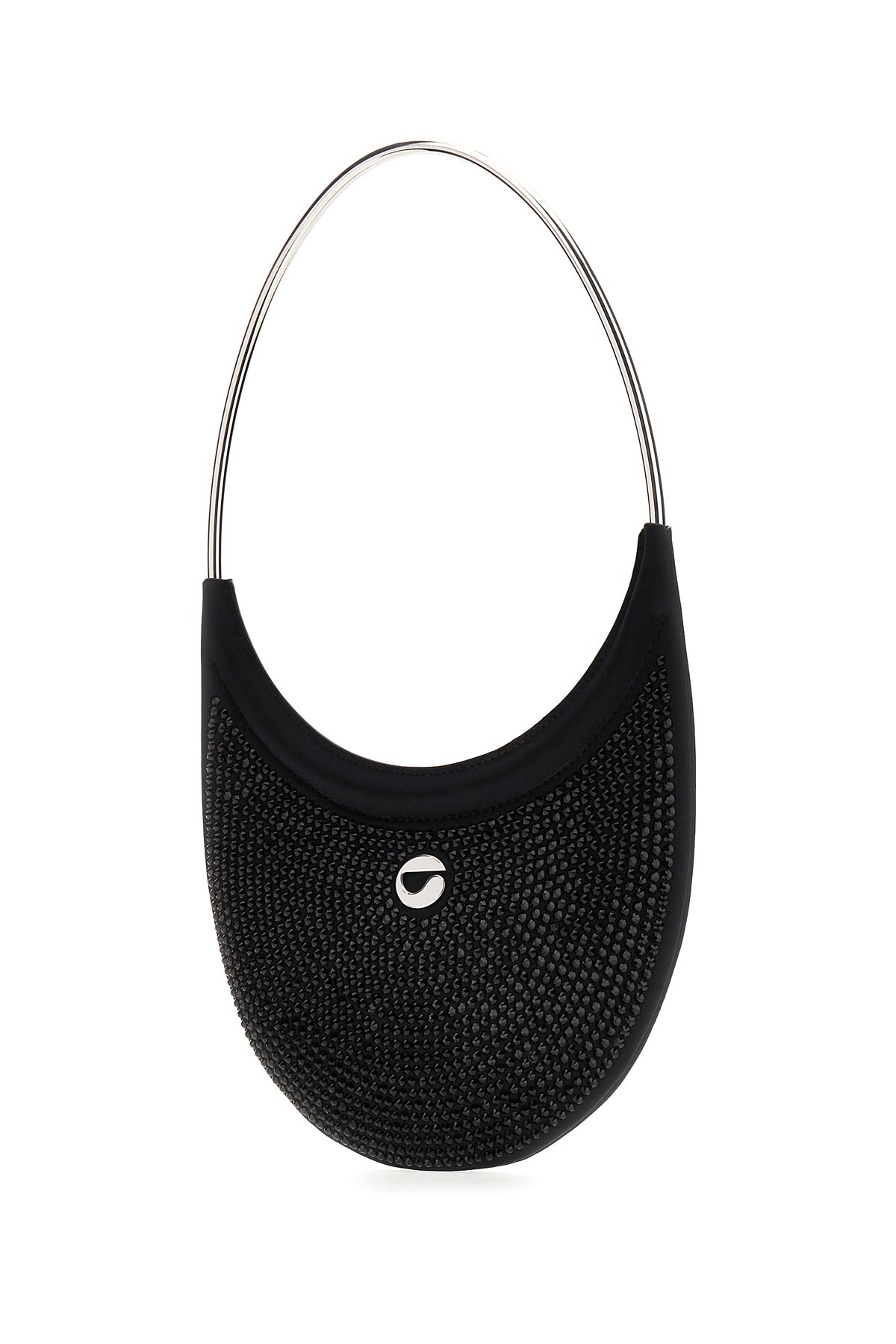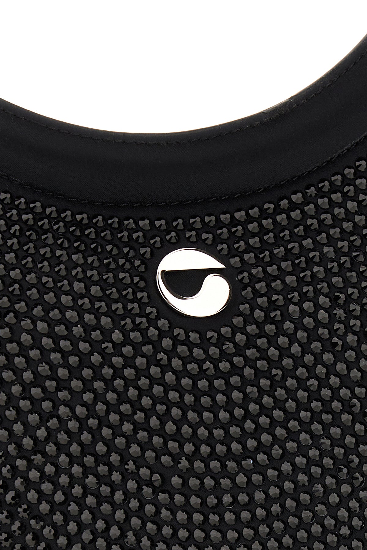 Shoulder bag realized in stretch cotton blend enriched by tonal rhinestones on the entire surface and metal logo at the front.