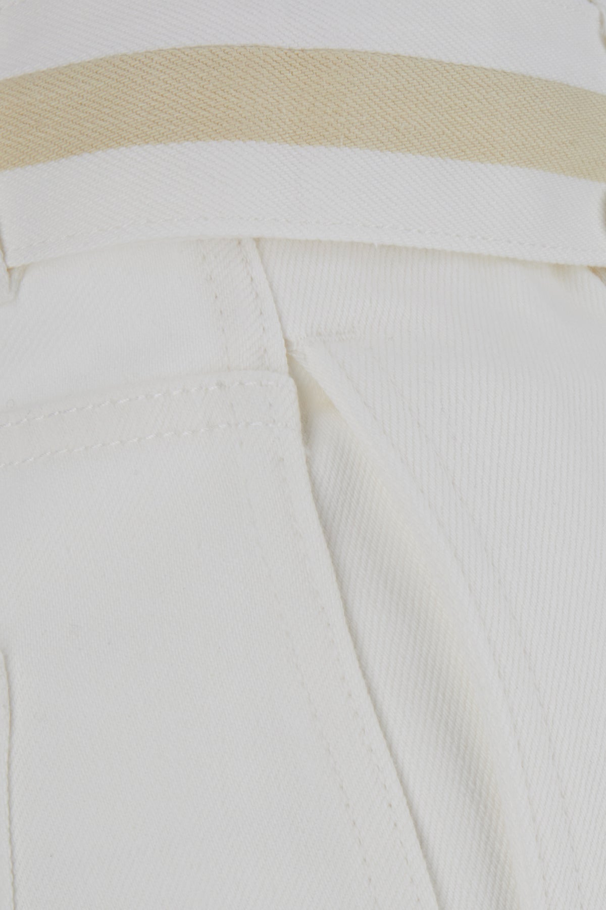 High-waist jeans realized in pure cotton denim enriched by adjustable detachable tonal fabric belt.