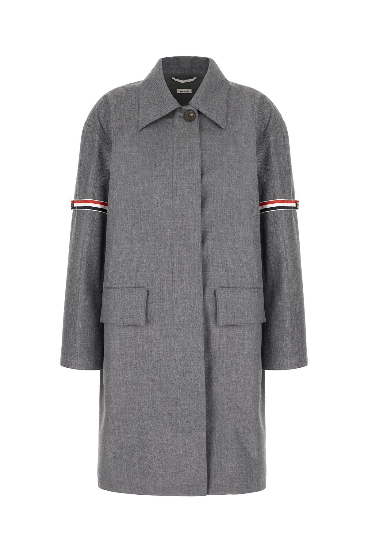 Overcoat realized in wool blend enriched by contrasting inserts on the sleeves and iconic tricolor label at the back.