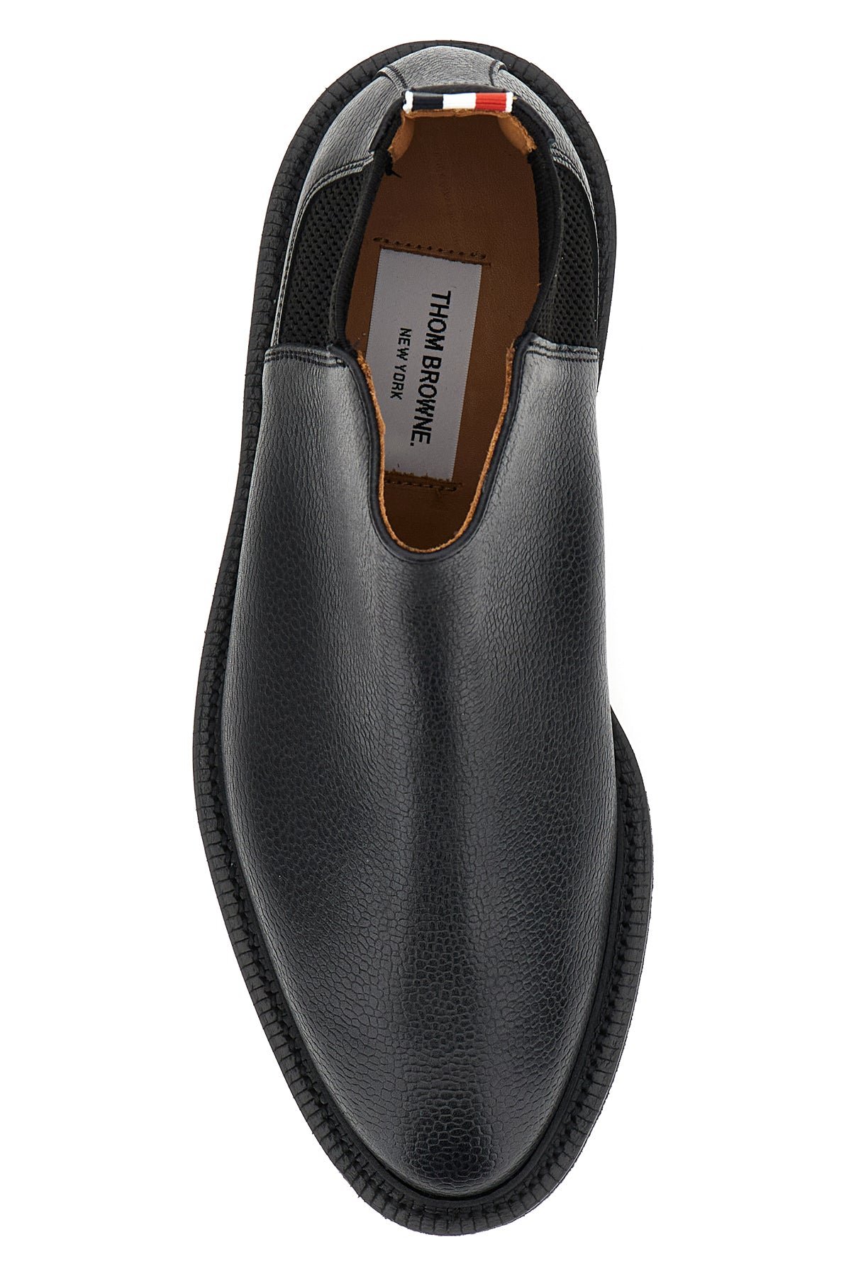 Ankle boots realized in pebble calf leather with tonal elastic fabric inserts enriched by iconic tricolor label at the back.