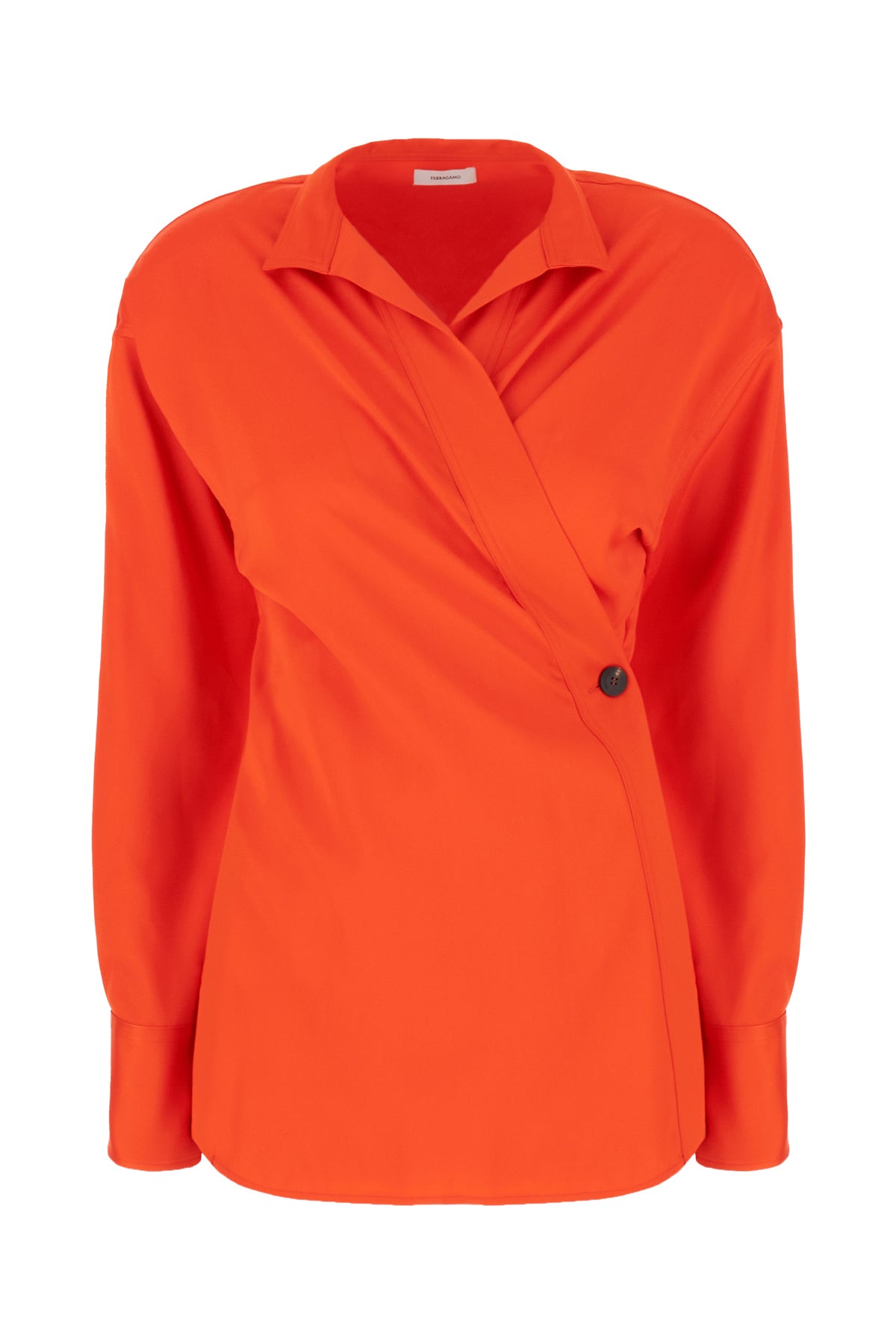 Blouse realized in stretch viscose characterized by wrap closure by buttons at the front.