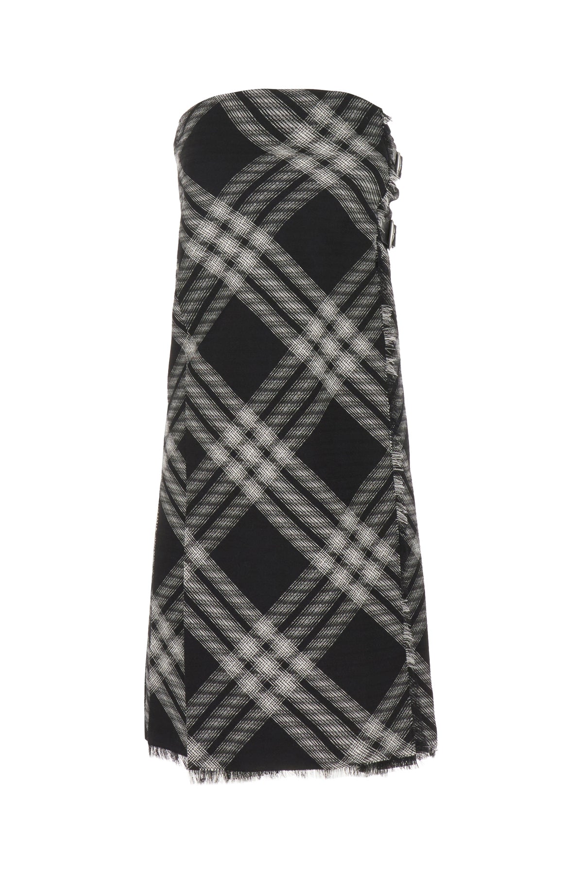 Off-the-shoulders dress realized in pure wool characterized by checkered embroidery on the entire surface.
