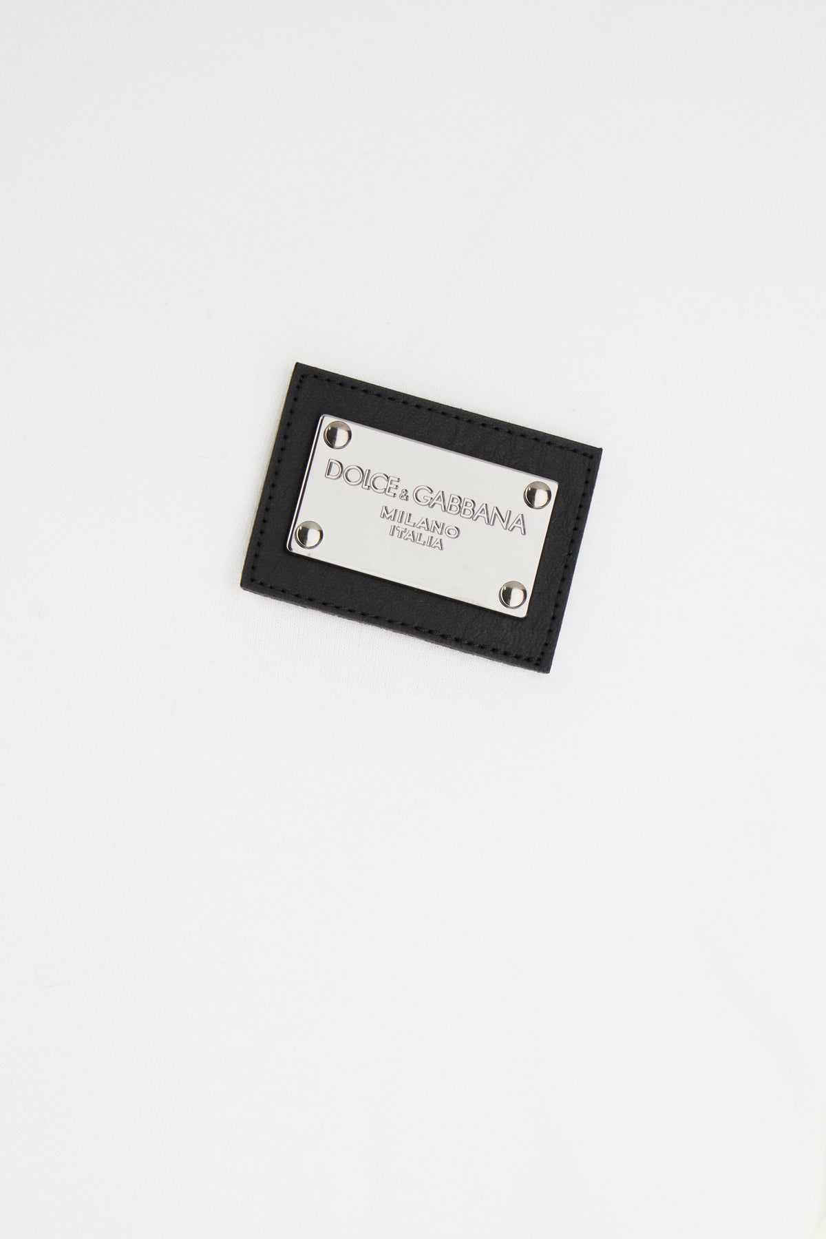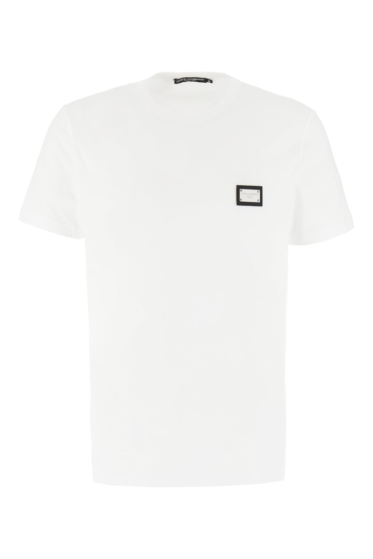 T-shirt realized in pure cotton enriched by metal logoed plate on the chest.