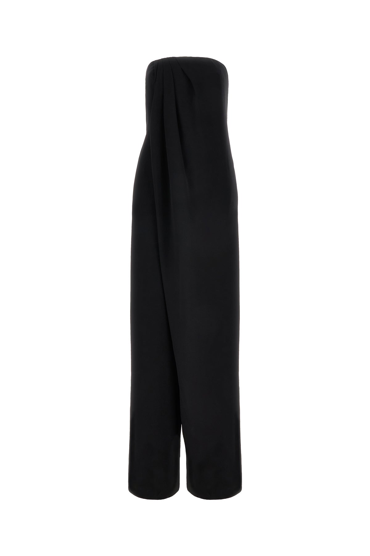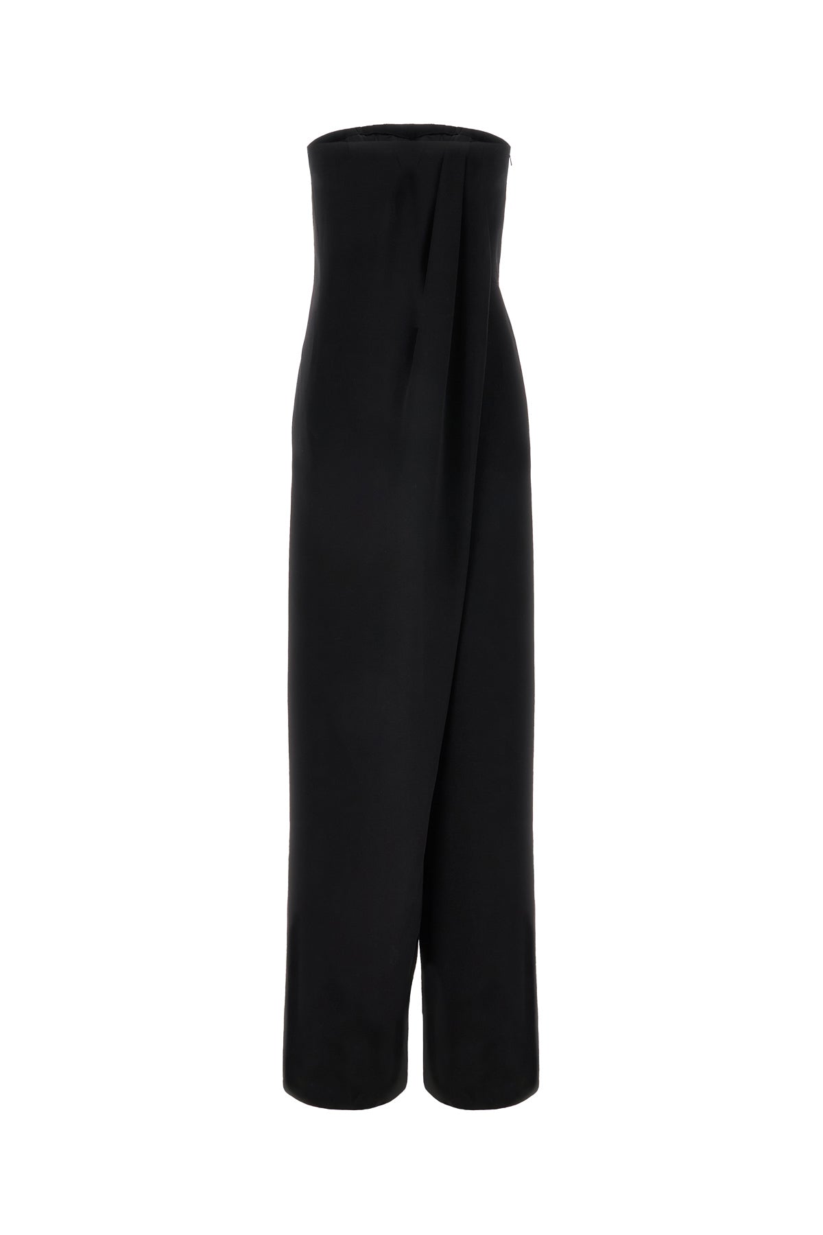 Strapless jumpsuit realized in triacetate blend characterized by drape at the front and at the back enriched by tonal fabric inserts on the sides.
