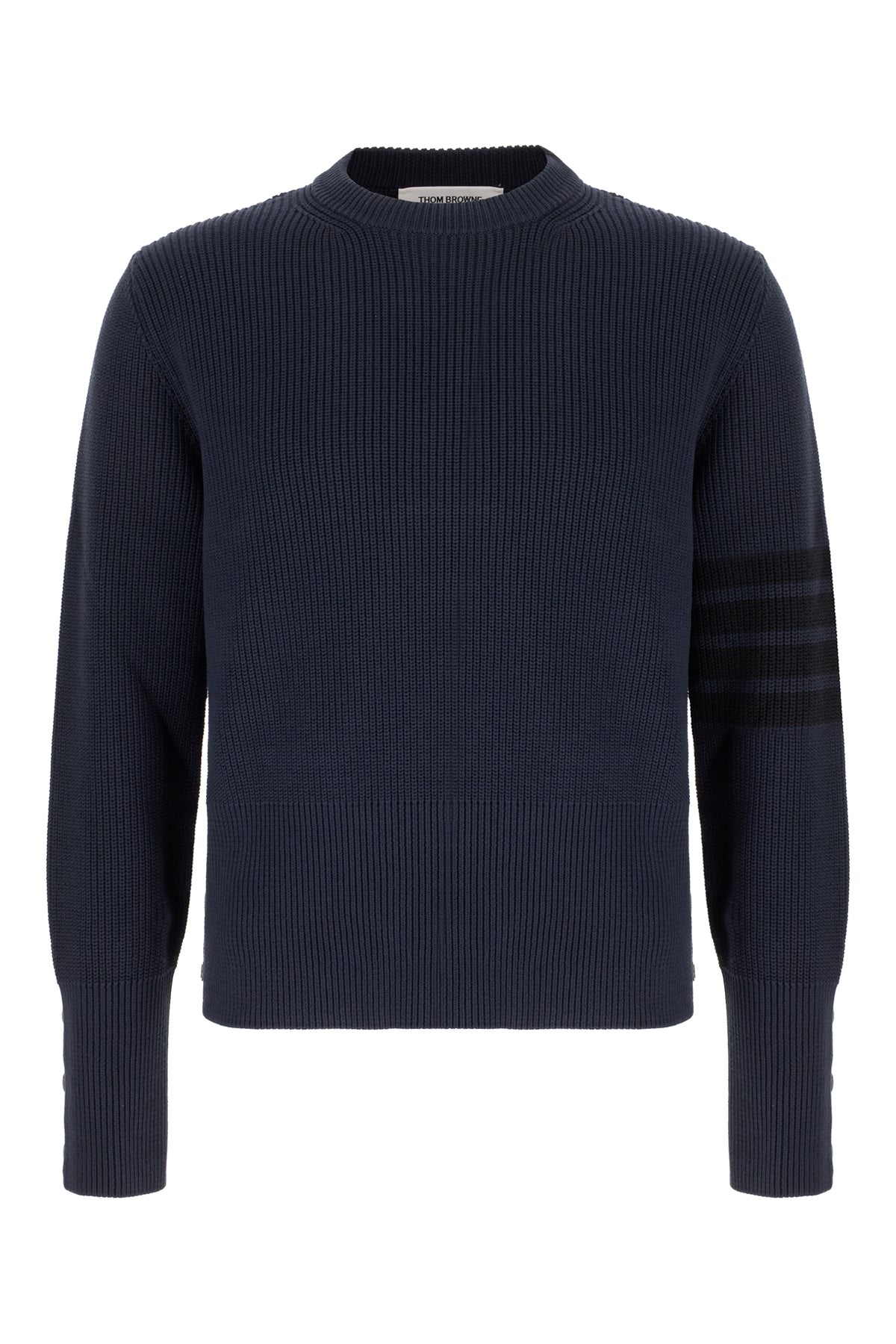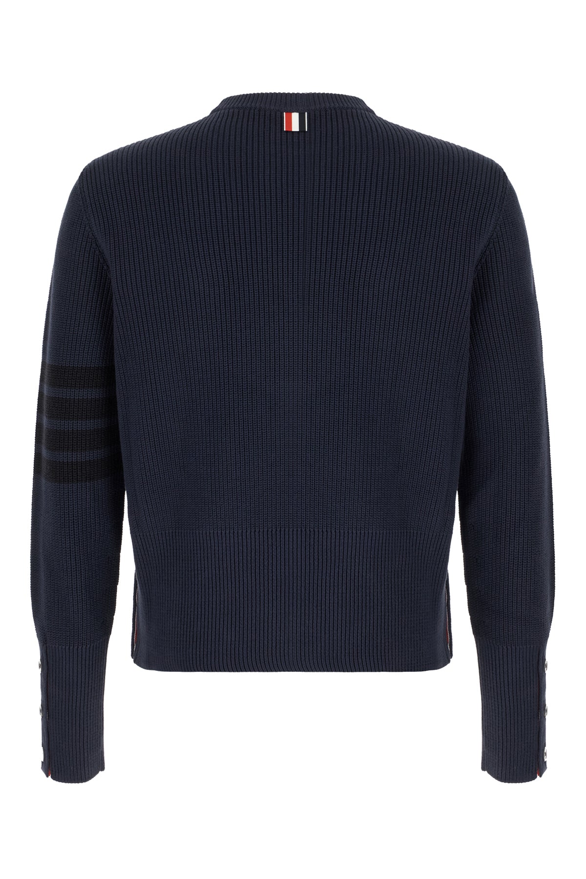Ribbed sweater realized in pure cotton characterized by contrasting embroidery on the sleeve enriched by iconic tricolor label at the back.