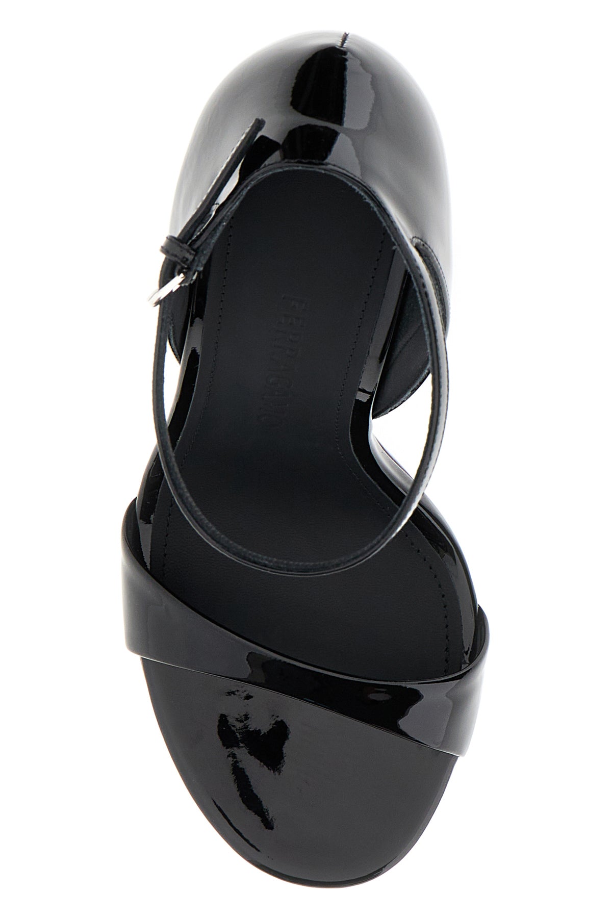 Sandals realized in patent calf leather characterized by peculiar wedge.