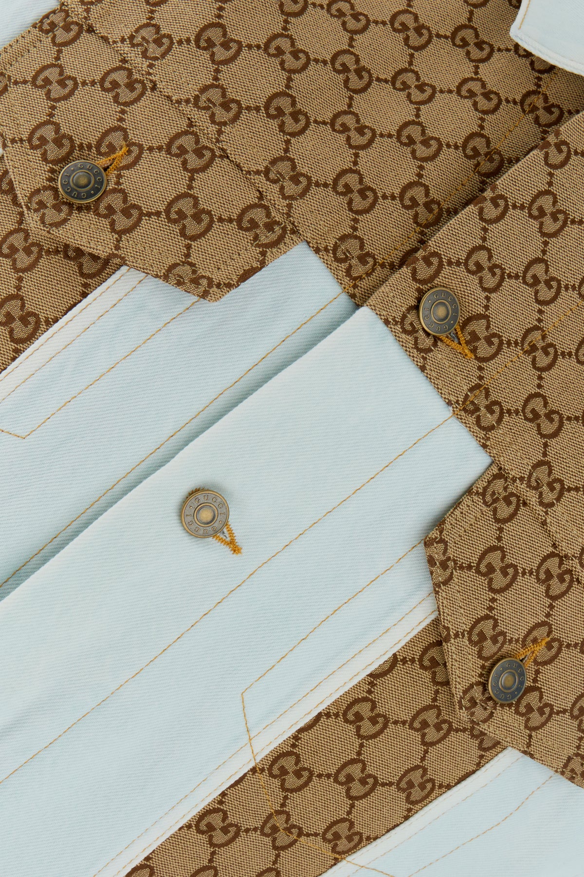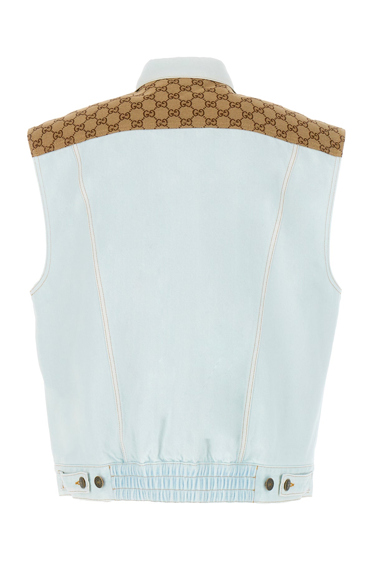 Sleeveless jacket realized in pure cotton denim with GG motif embroidered fabric inserts on the upper enriched by adjustable tonal fabric straps on the hemline.