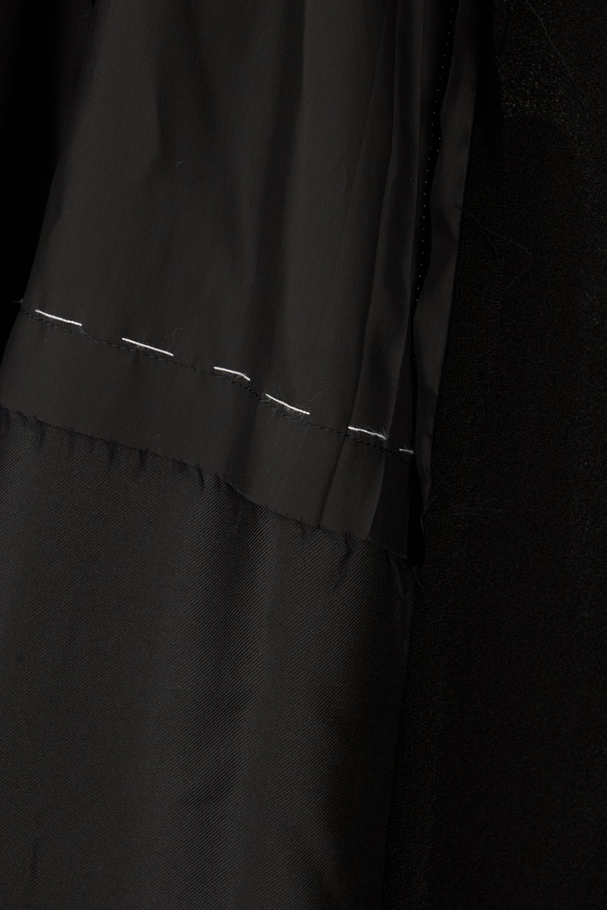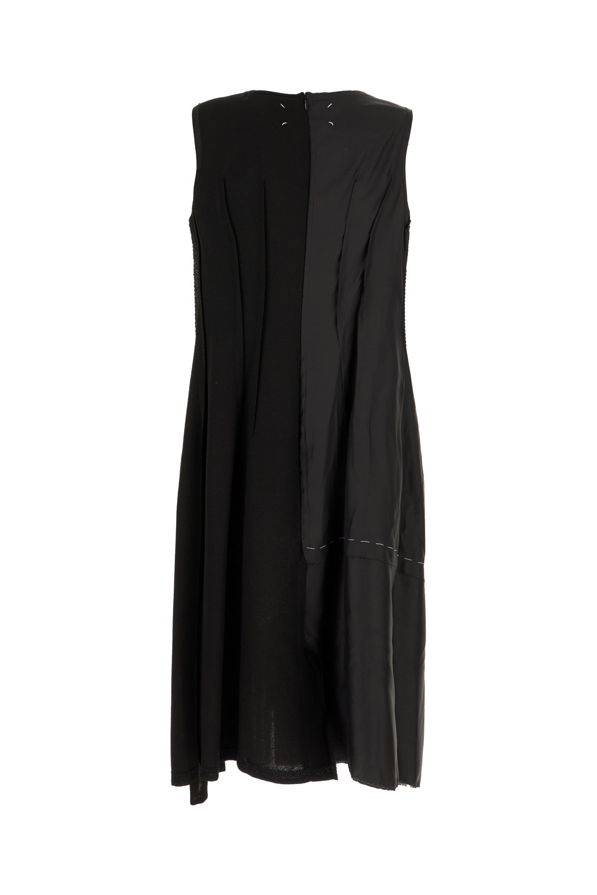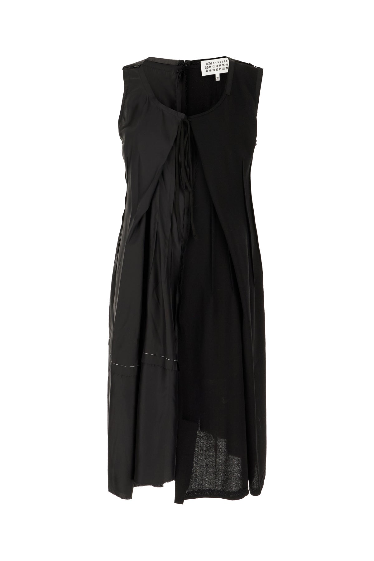 Asymmetric dress realized in pure wool with silk inserts enriched by laces to tie at the front and contrasting iconic stitchings at the back.