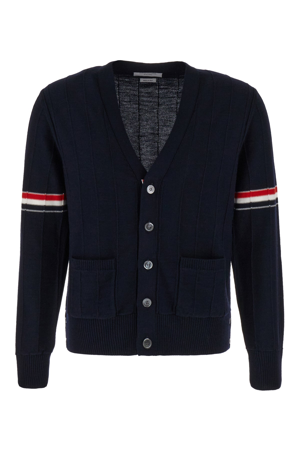 Cardigan realized in pure wool characterized by contrasting striped embroidery on the sleeves enriched by iconic tricolor label at the back.