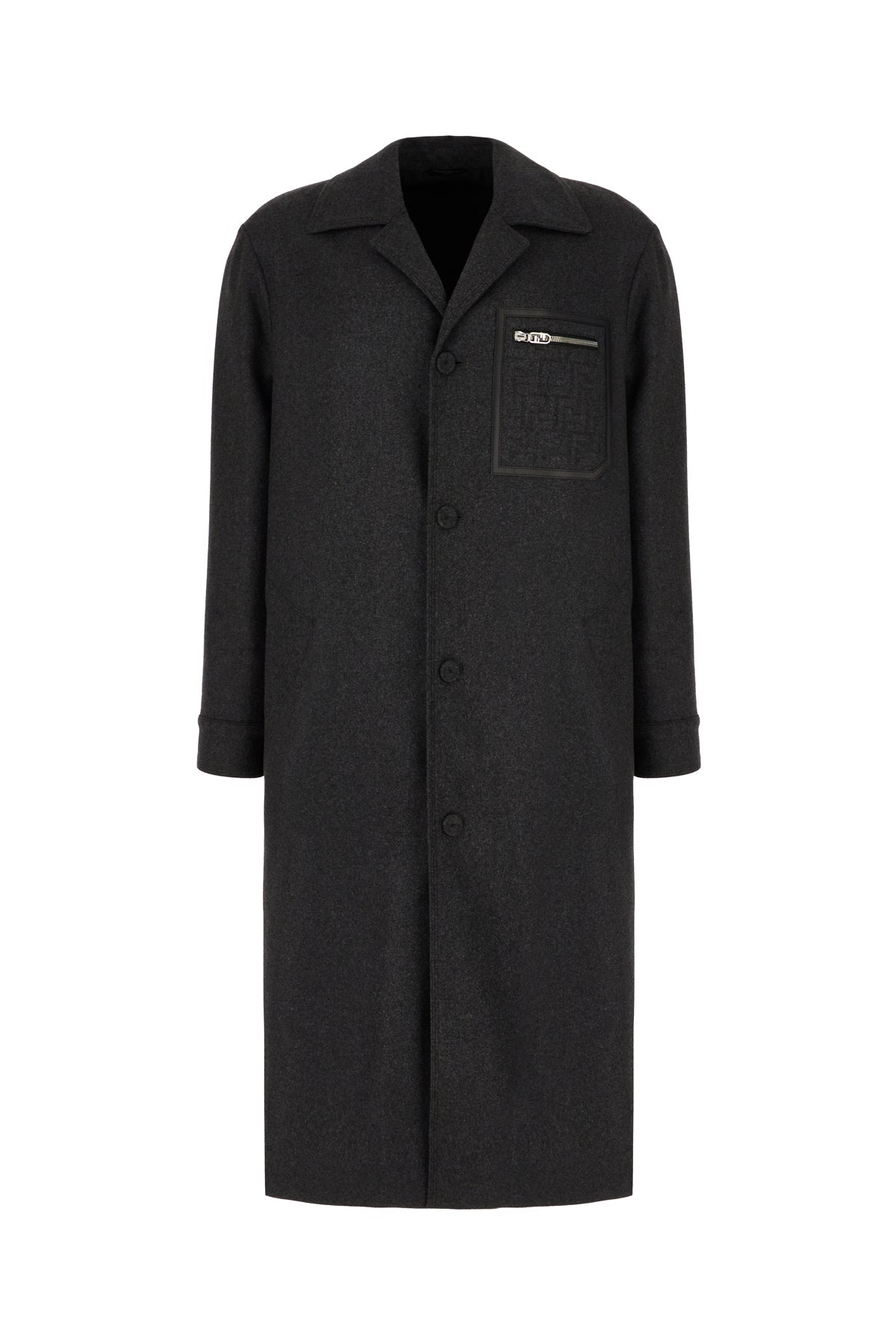 Coat realized in stretch cashmere characterized by a patch pocket with FF motif printed in relief at the front.