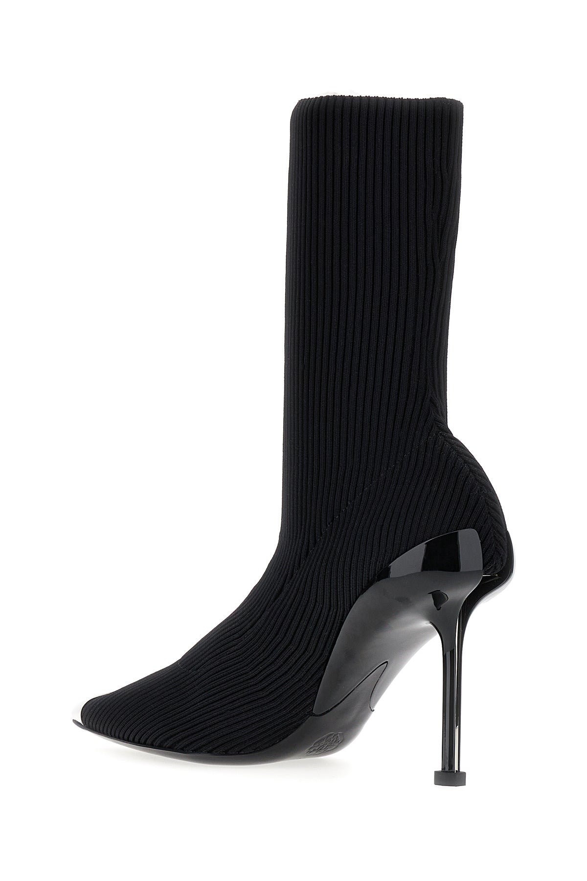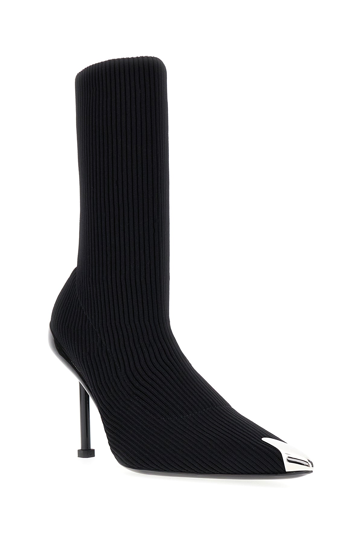 Stivaletti realizzati in nylon stretch a costine arricchite da dettaglio in metallo sulla punta.