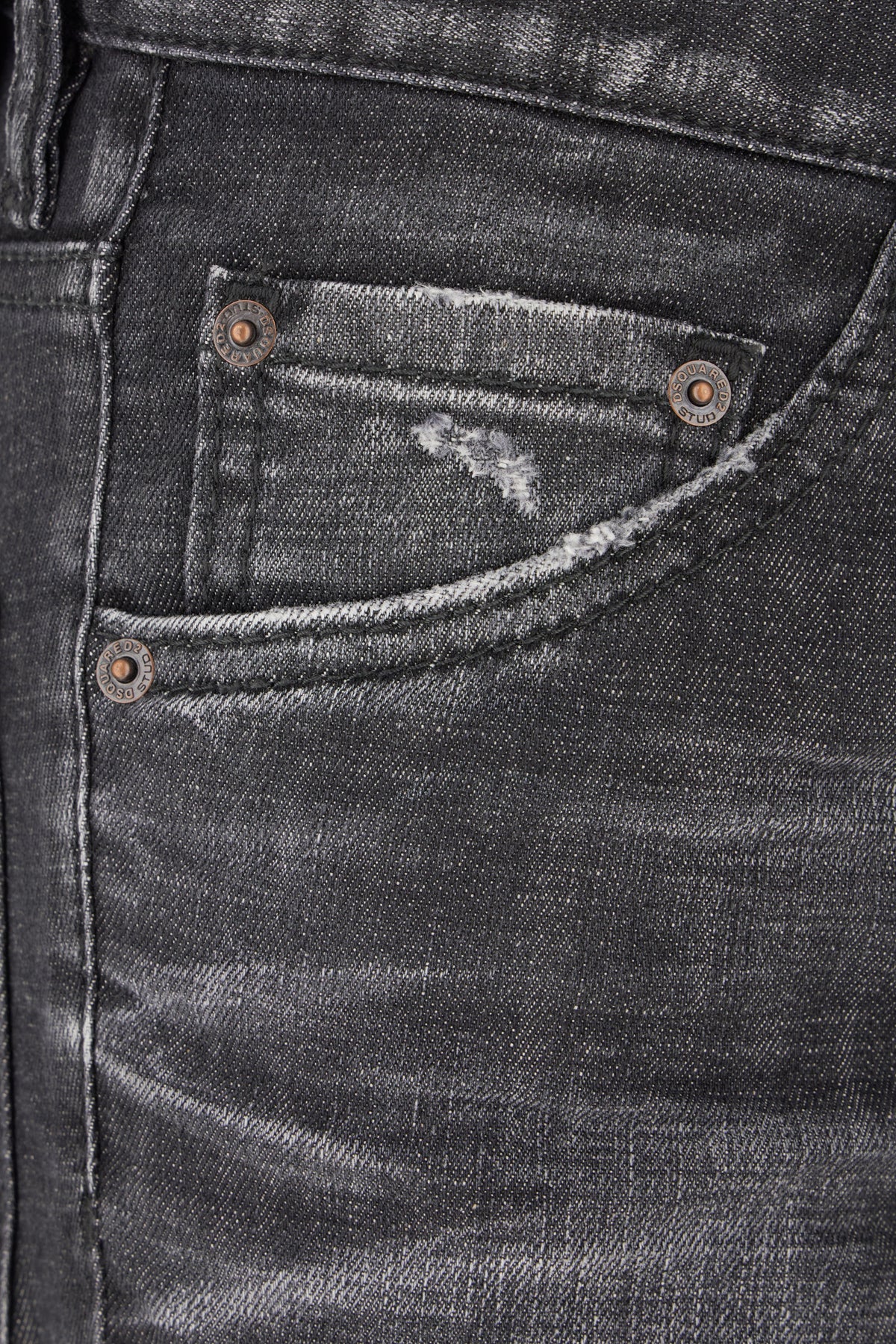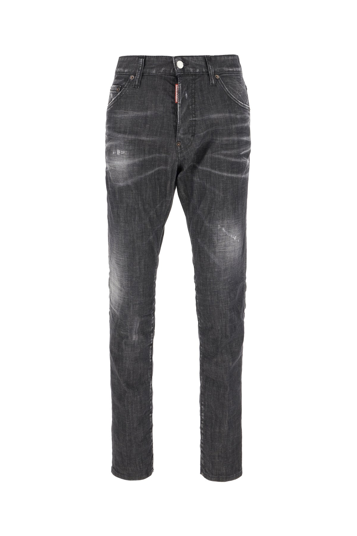 Jeans realizzati in denim di cotone stretch ad effetto usurato arricchiti da etichetta logata in pelle a contrasto sul retro.