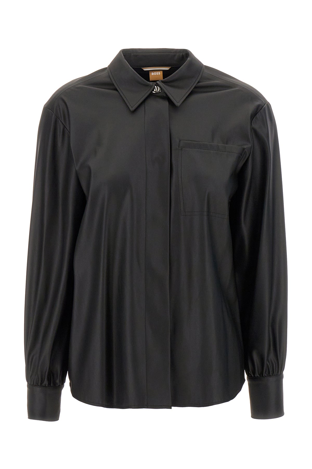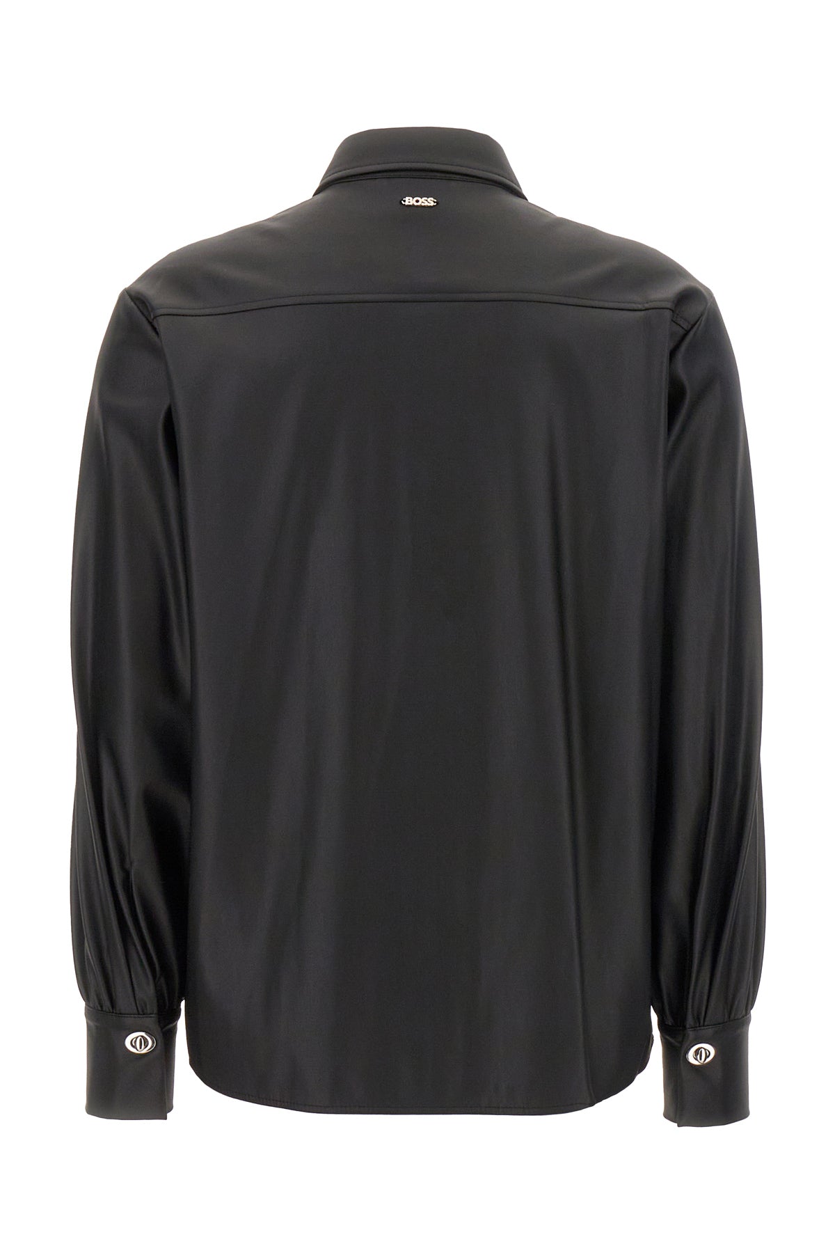 Camicia realizzata in simil pelle caratterizzata da particolari bottoni sui polsini angolari e sul colletto arricchita da logo in lettere metalliche sul retro.