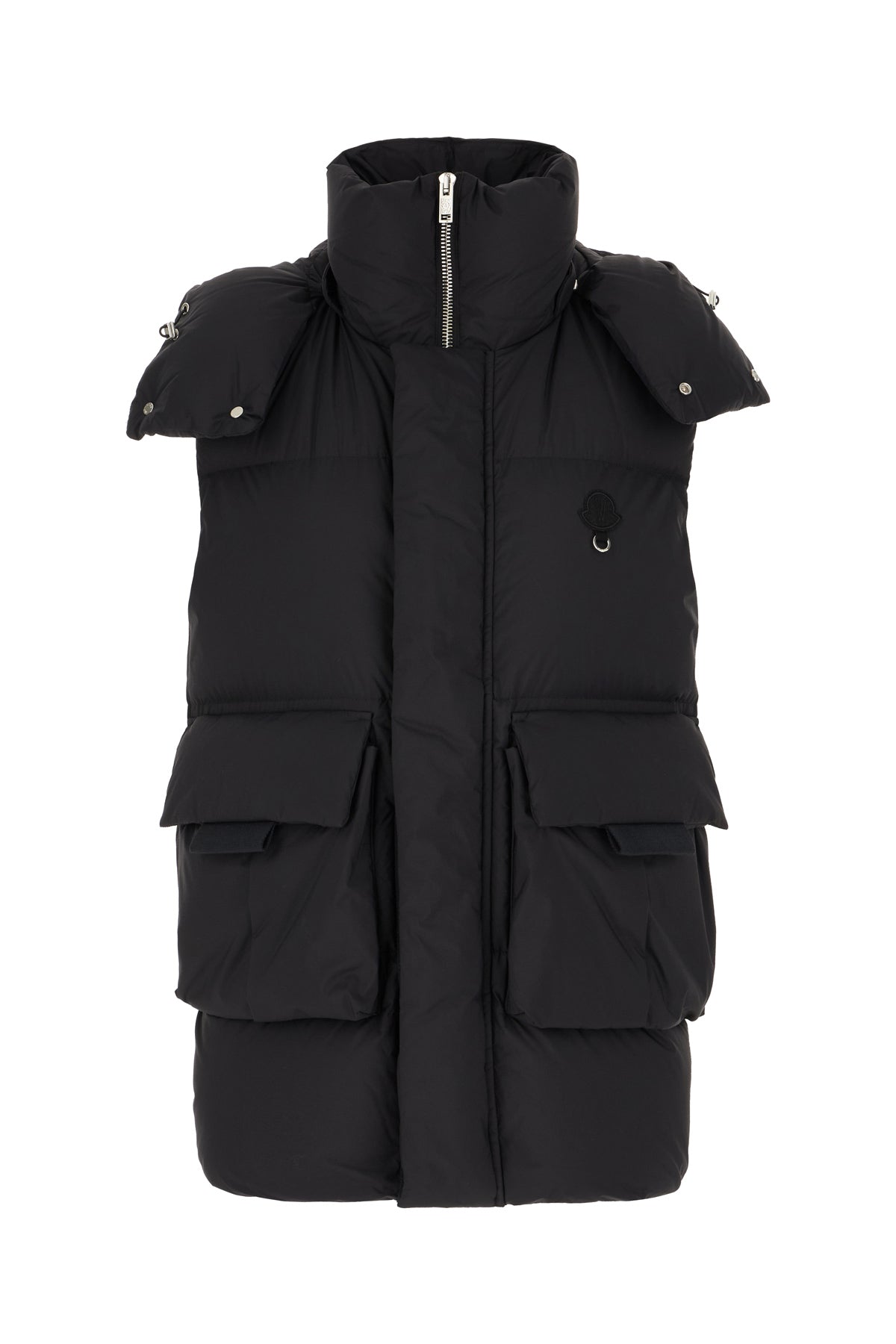 Piumino smanicato realizzato in nylon arricchito da applicazione logata floccata tonale sulla parte frontale.
