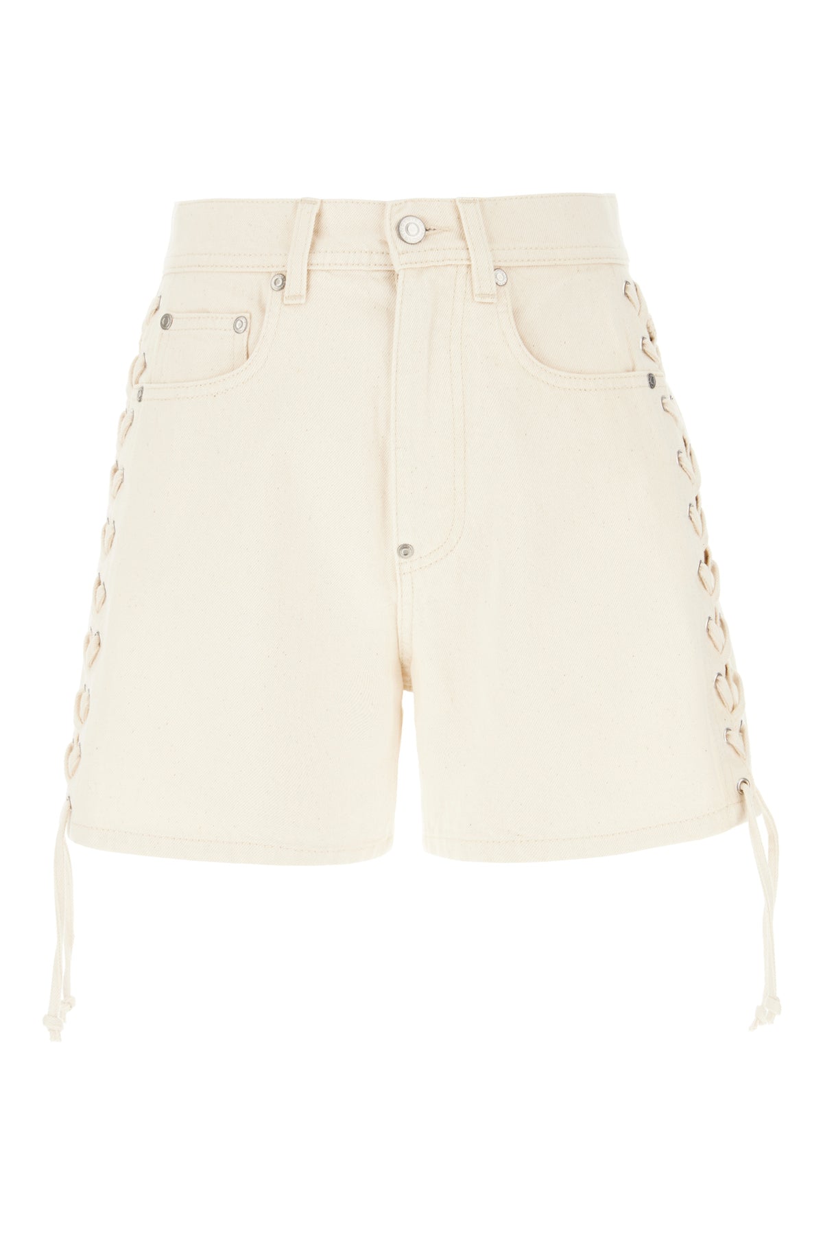 Shorts realizzati in denim di puro cotone arricchiti da etichetta logata in pelle a contrasto sul retro e lacci da annodare con spacchi sui lati.