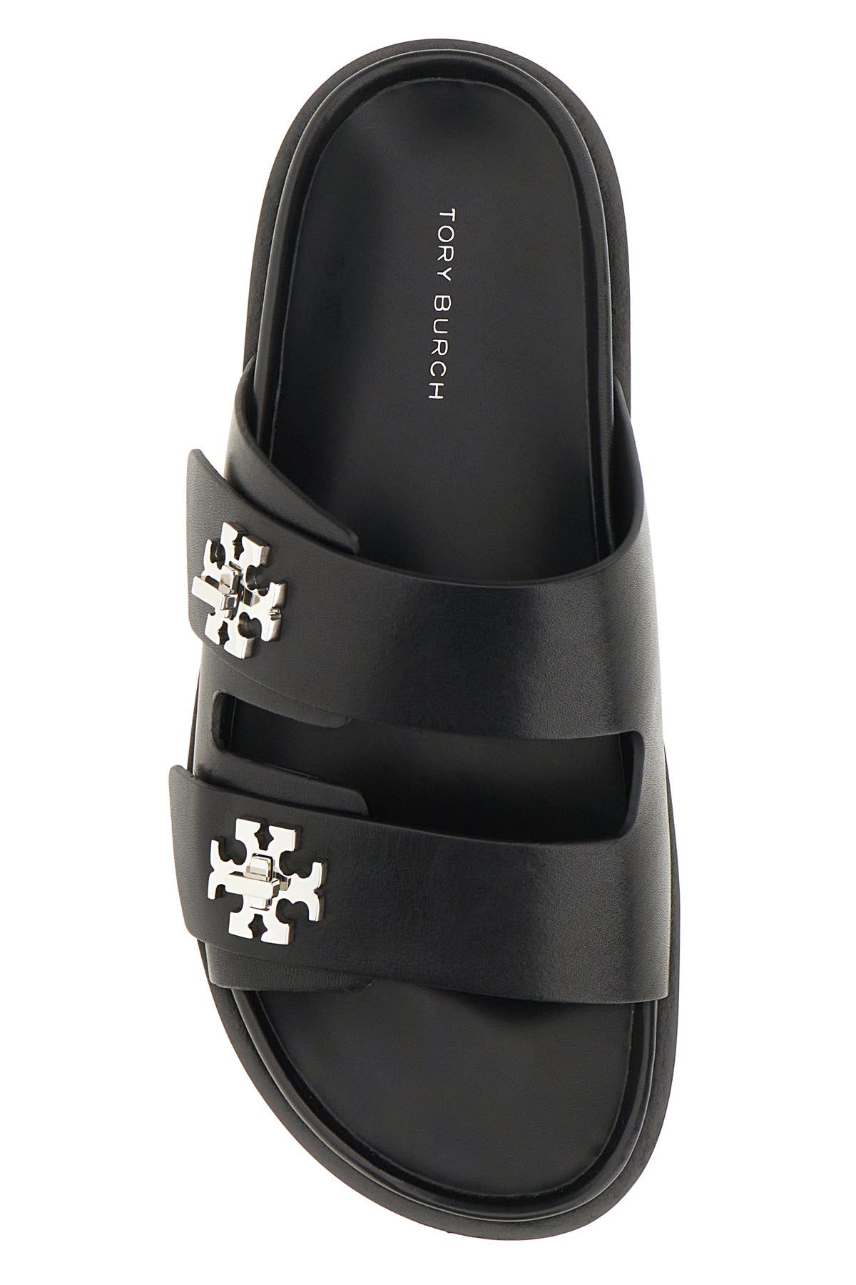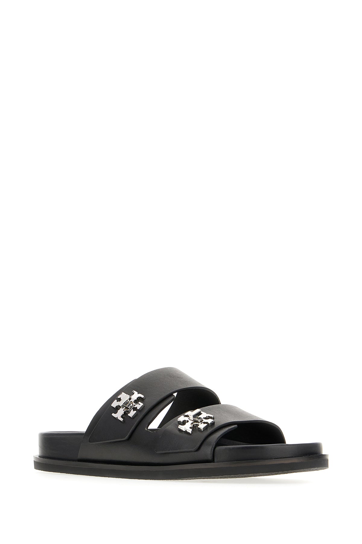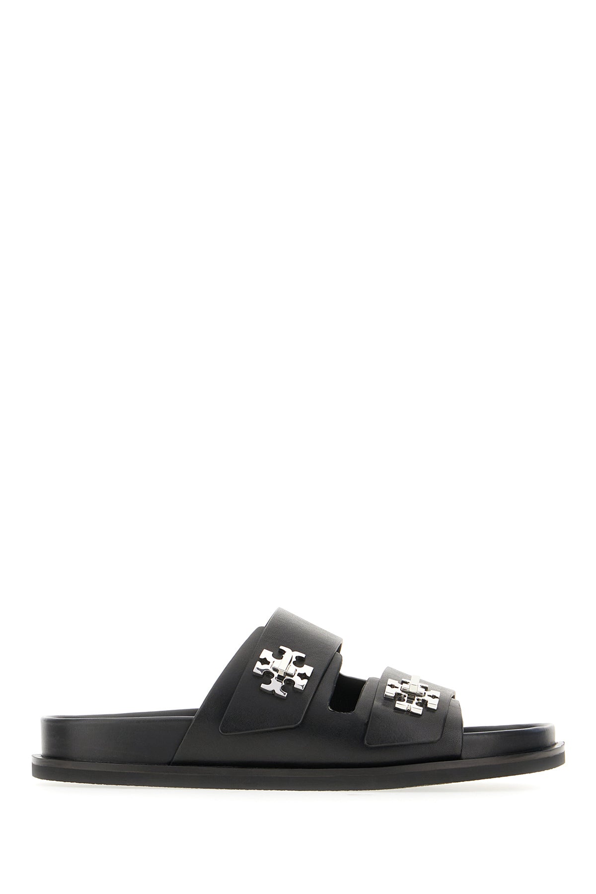 Slippers realizzate in pelle liscia arricchita da dettagli metallici logati sul collo del piede.