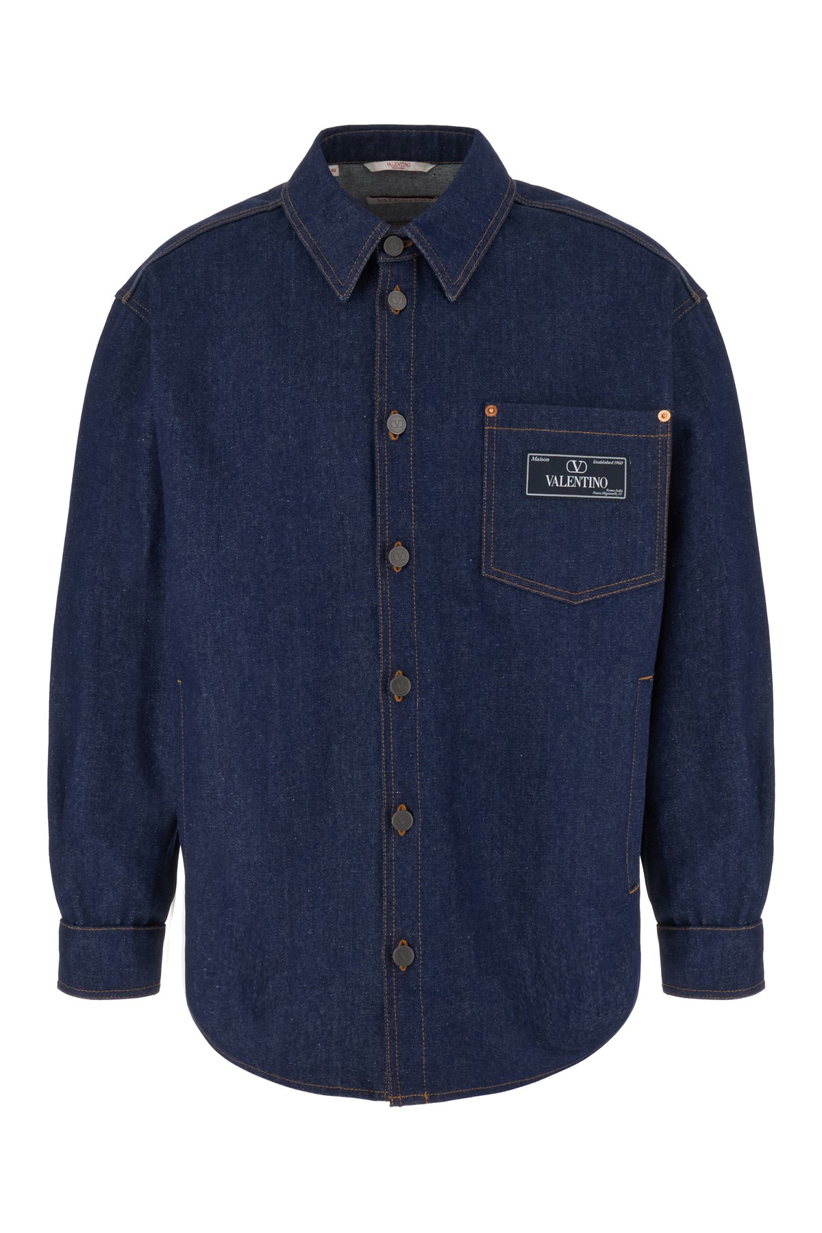 Camicia realizzata in denim di puro cotone slavato arricchita da etichetta logata a contrasto sul petto.