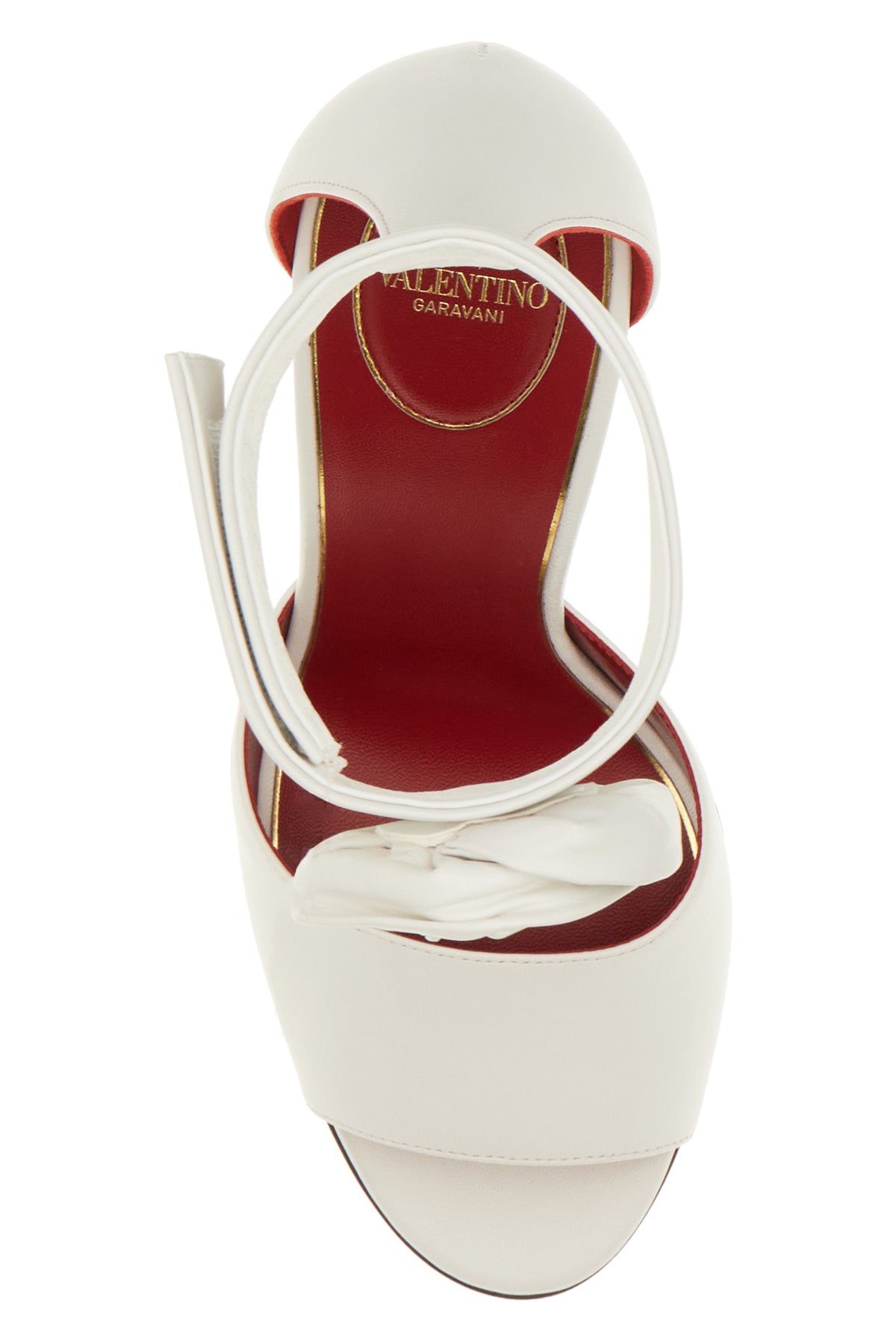 Sandali realizzati in pelle ovina martellata arricchita da applicazione Rosa con cristalli sulla caviglia e dettaglio metallico VLogo Signature sul tacco a stiletto.